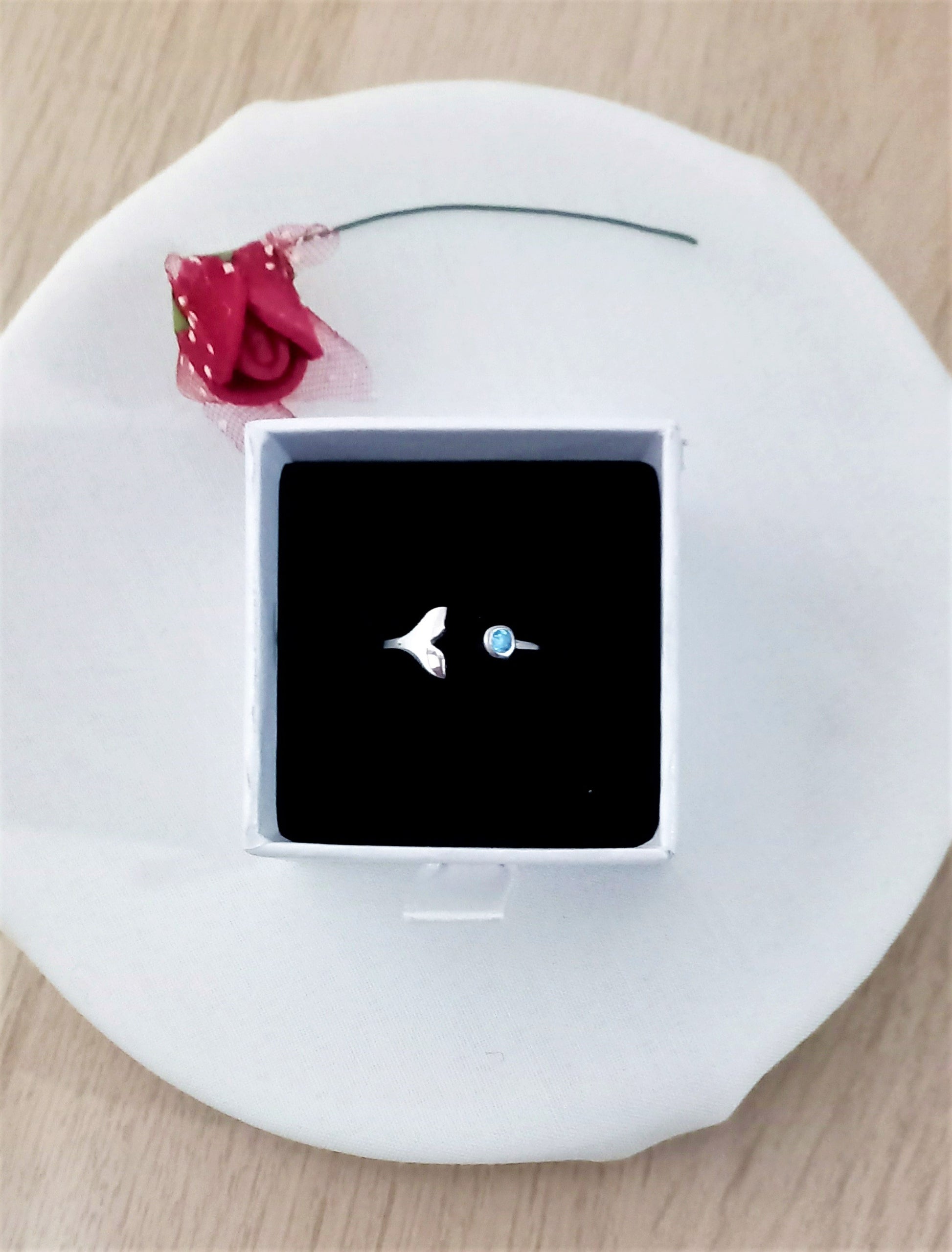 Un precioso anillo abierto con la silueta de la cola de ballena y circonita azul en plata de ley para mujer.