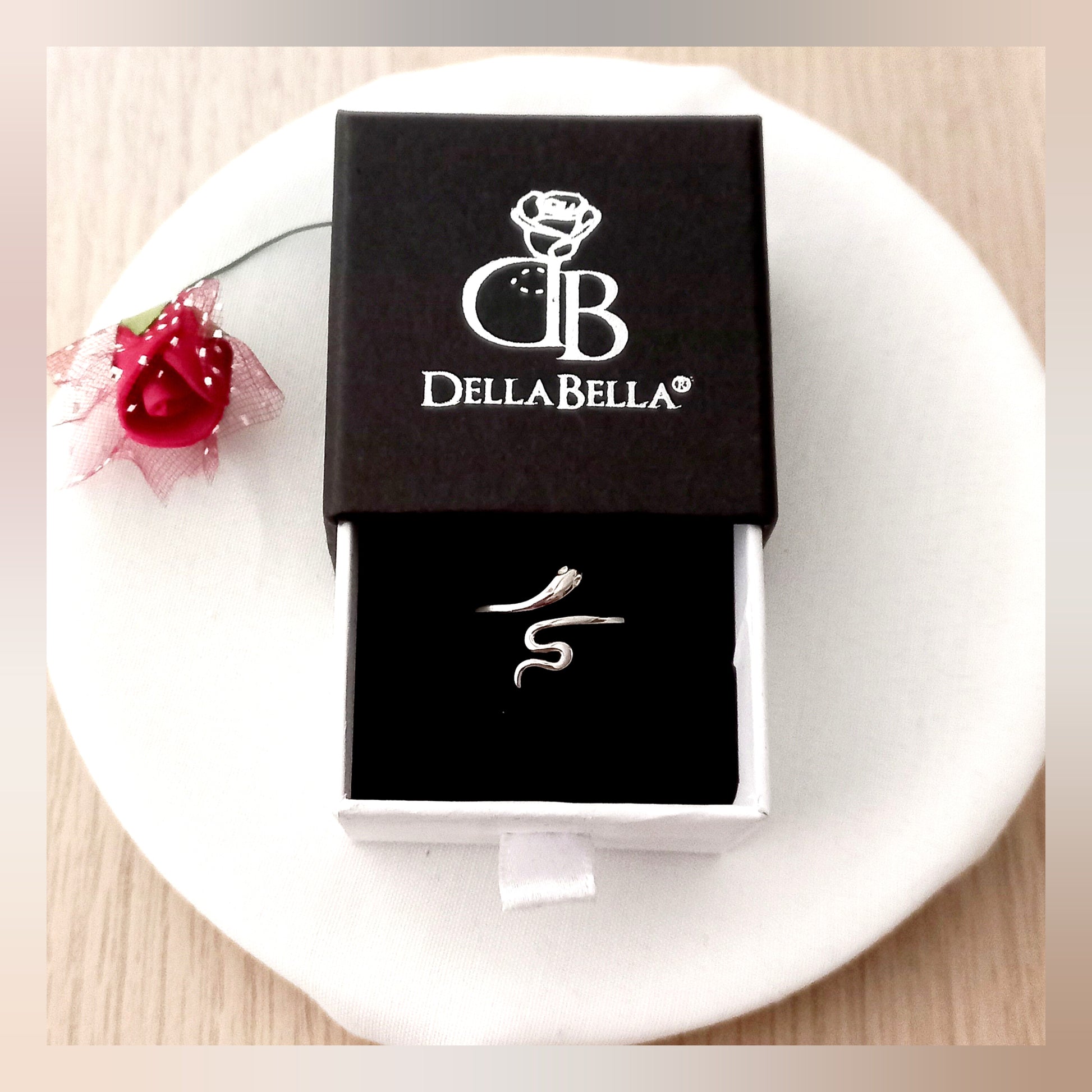 Un bonito y moderno anillo en forma de serpiente en plata de ley ajustable al dedo.