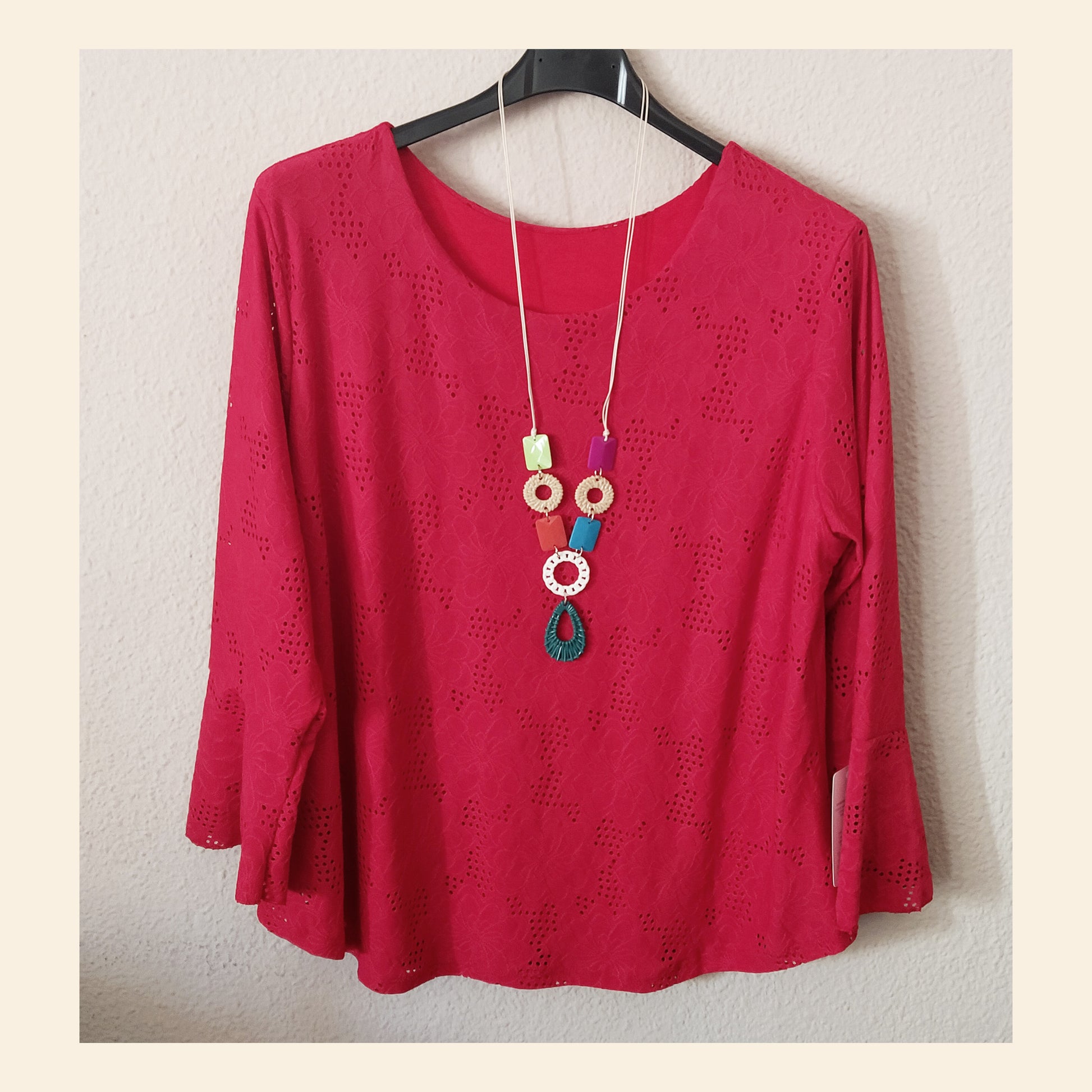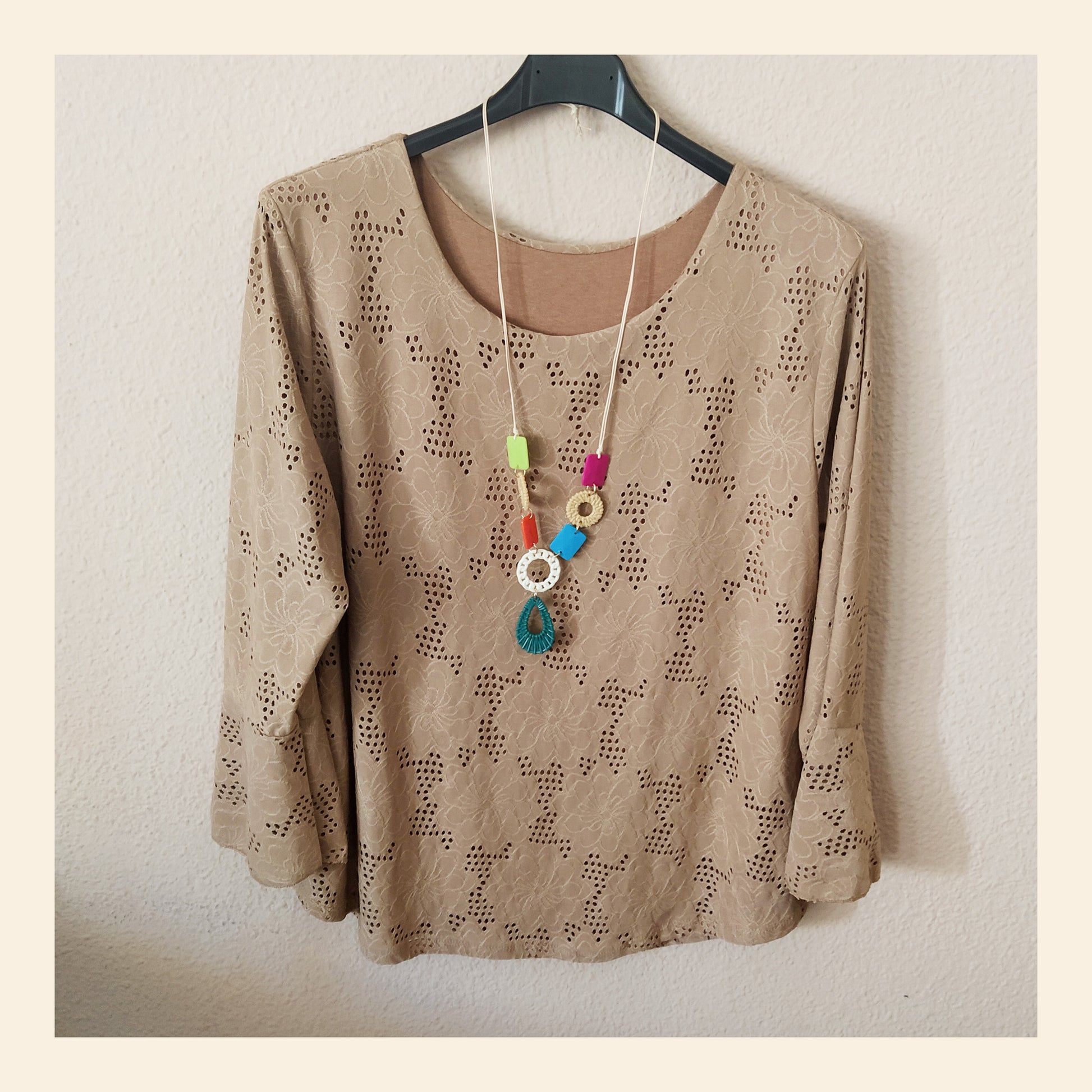 Blusa de media manga y ancha con transparencias en las mangas y forro central. Incluye collar de colores.
