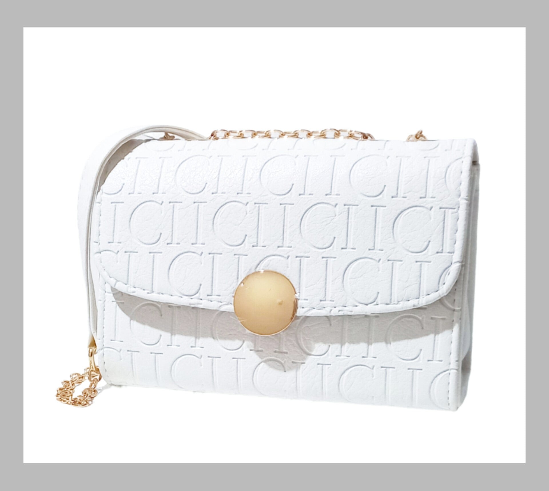 Un bonito y elegante bolso con estampado de letras C I en blanco roto. Cadena dorada para el hombro. Contiene 2 bolsillos abiertos y uno en el centro con cremallera.