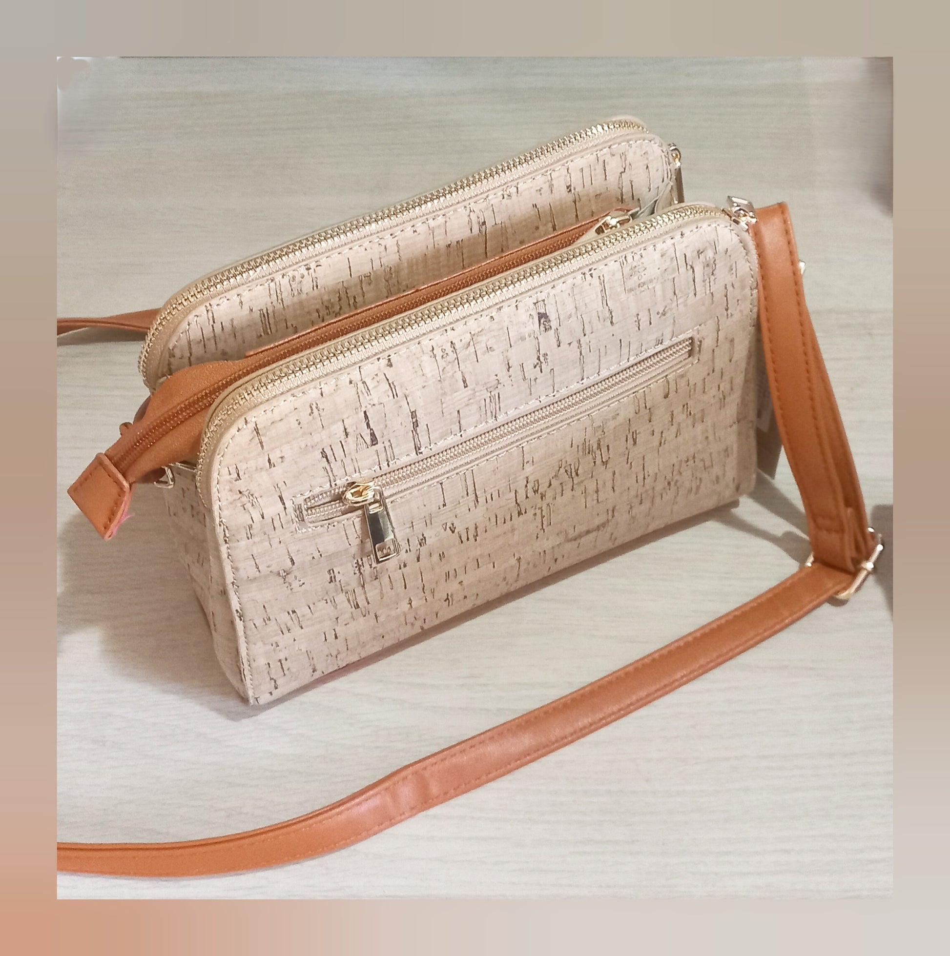 Bolso de corcho cómodo con correa para el hombro ajustable. Tres bolsillos de cremalleras en el centro y otro por detrás, tamaño mediano para llevar a diario.