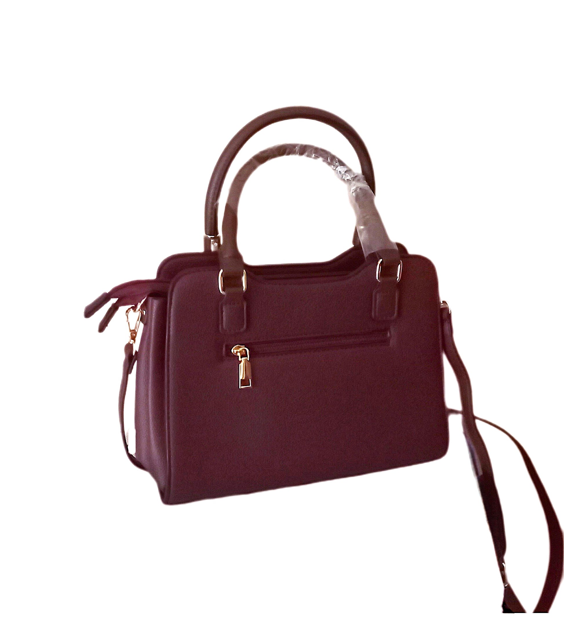 Un elegante bolso liso de mano con correa para el hombro en burdeos con adornos dorado para mujer.