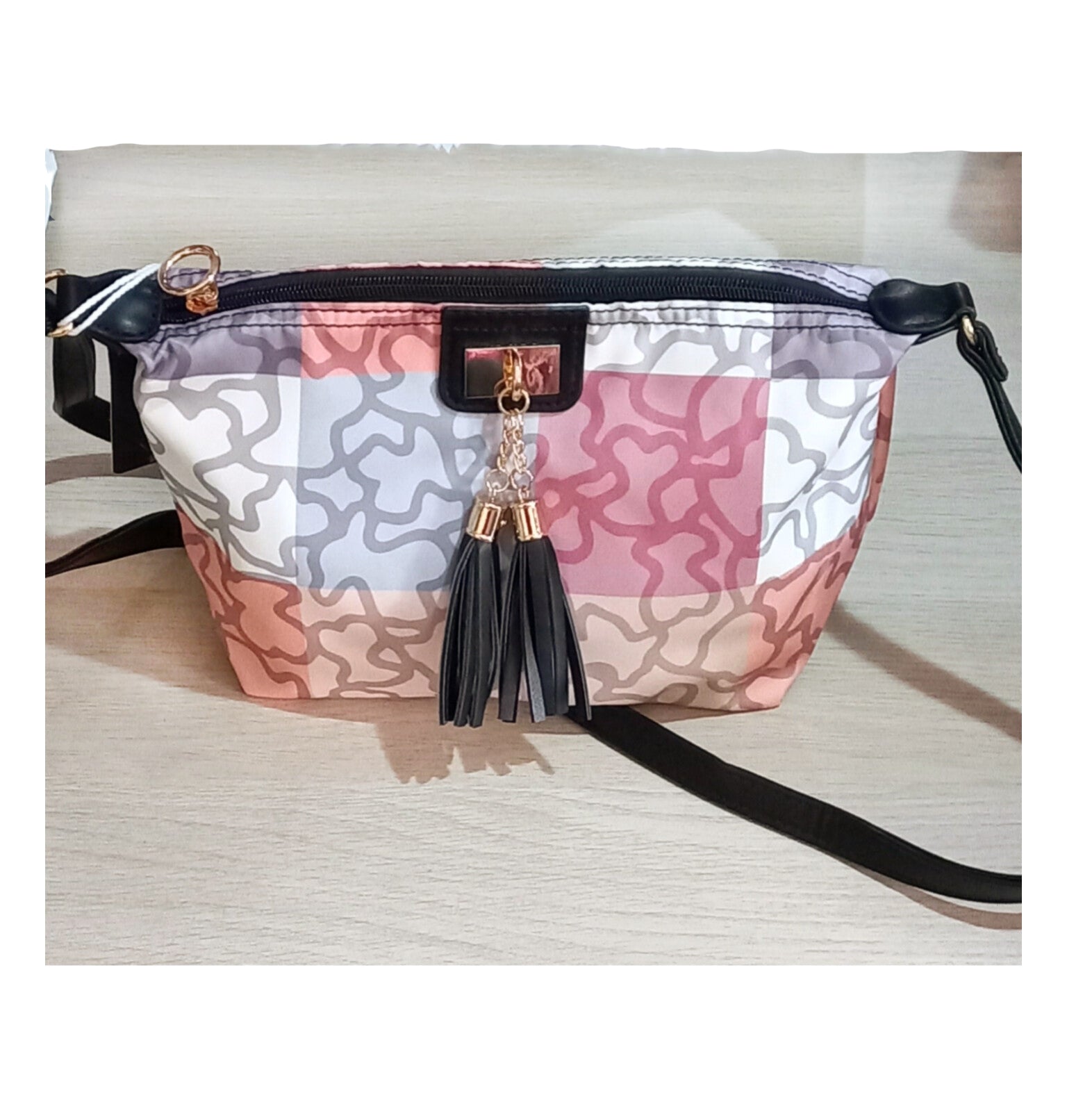 Un bonito bolso con dibujos de osos de varios colores y correa de cuero negro para el hombro con detalles en dorado. Por dentro tiene varios bolsillos con cremallera. En la parte trasera tiene otro bolsillo más.
