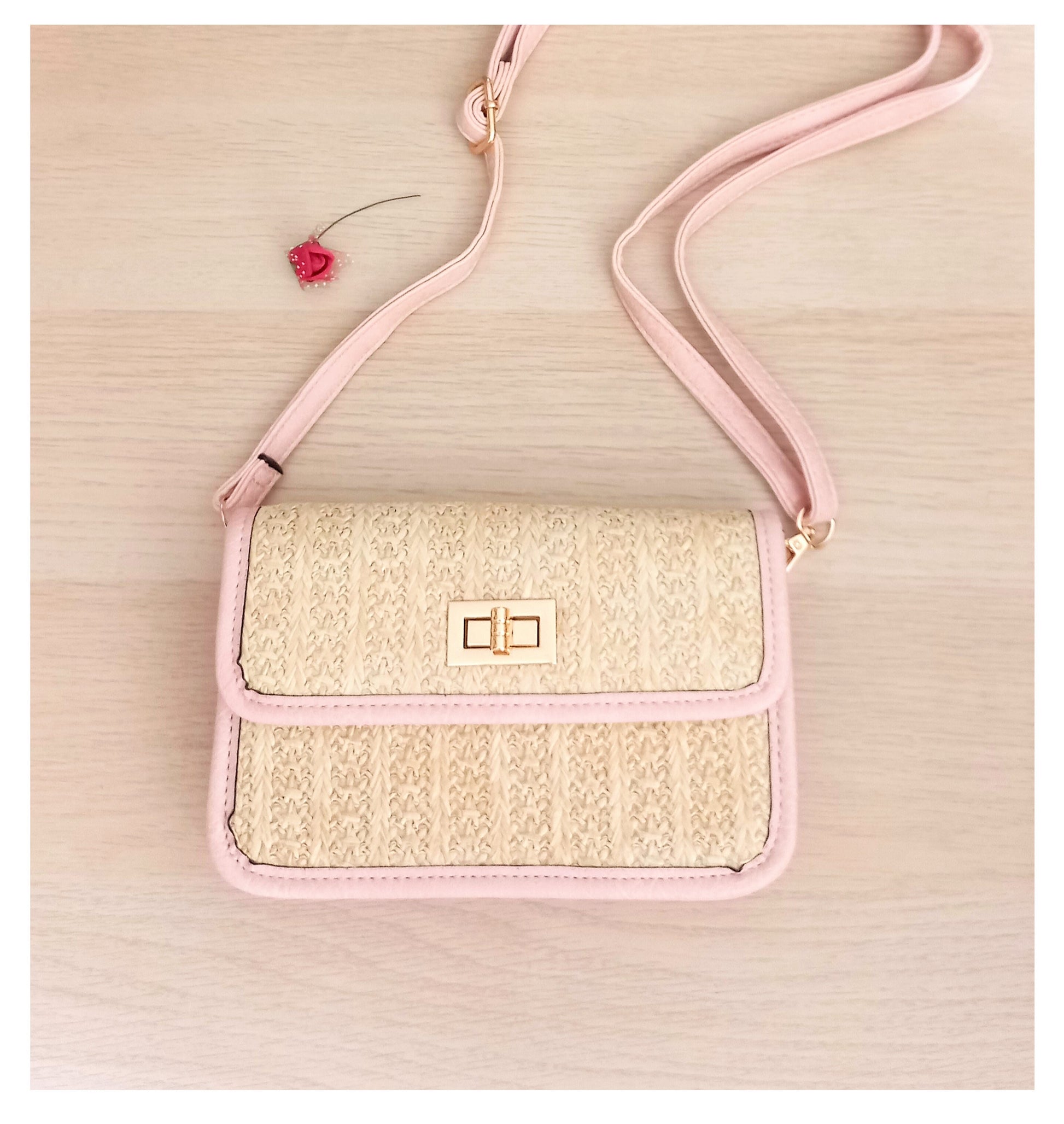 Un bonito bolso pequeño de rafia y cuero, con los bordes y la correa en tono rosa pastel extensible, con adornos dorados. En el interior, lateral, tiene 2 ranuras para colocar tarjetas.