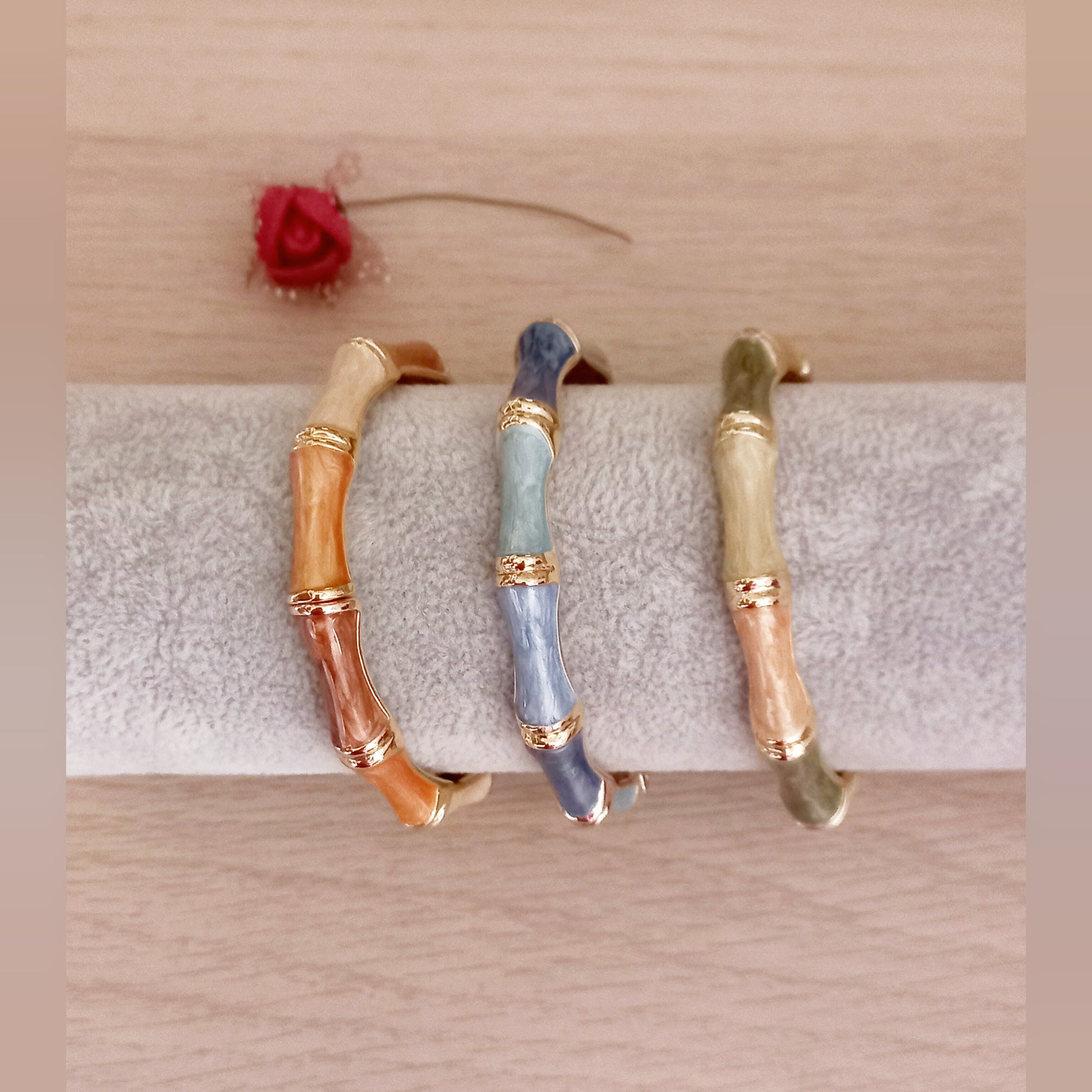 Un bonito brazalete en forma de bambú en varios colores y dorado para mujer.