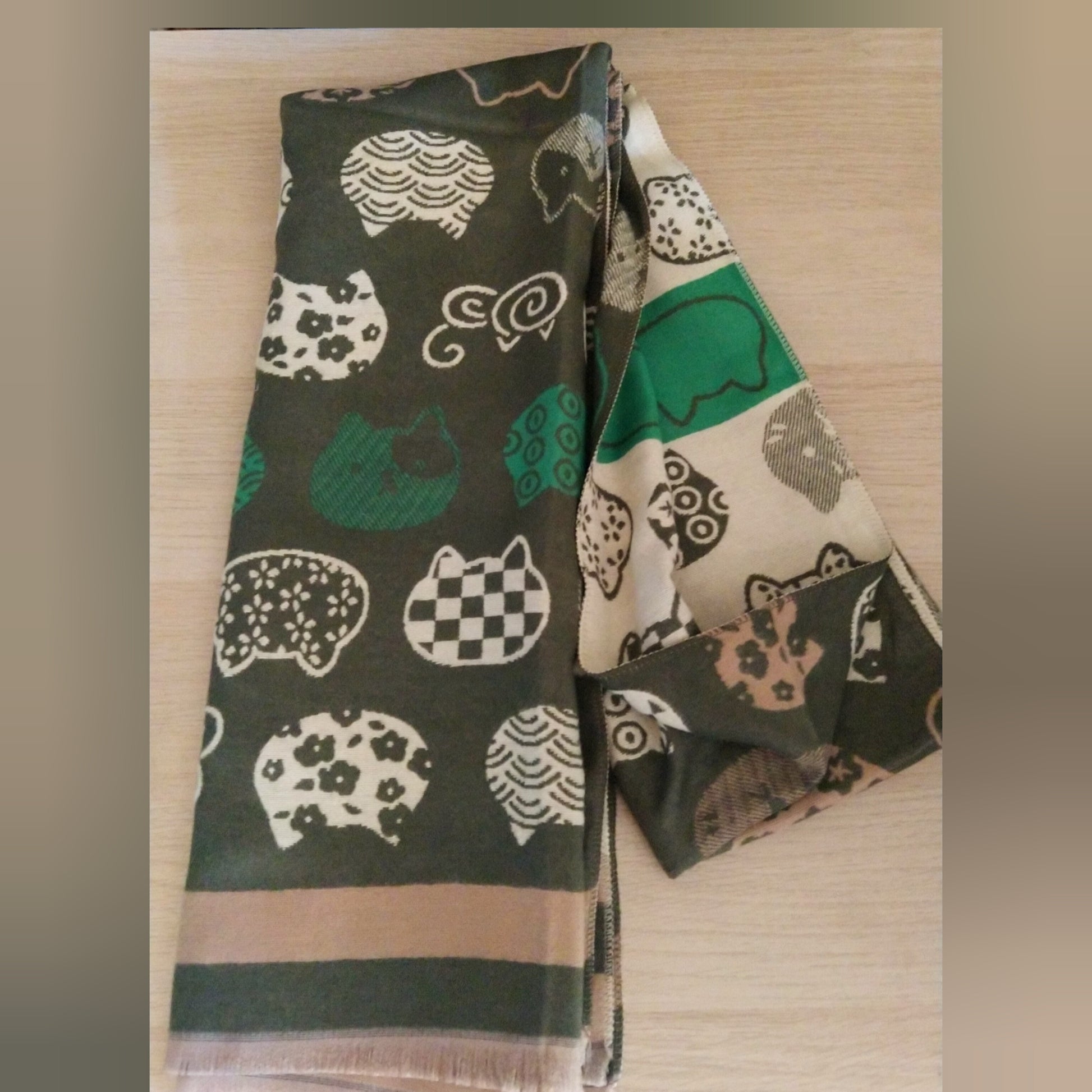 Bufanda verde y beige reversible con dibujos de cabezas de gatos calentita y suave al tacto para invierno para mujer.