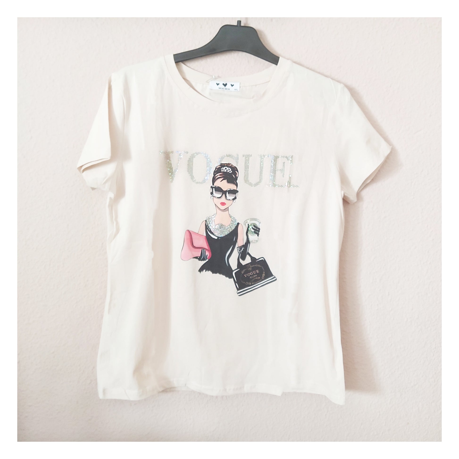 Camiseta de manga corta en blanco roto, beige o marrón claro con dibujo de mujer Vogue para mujer.