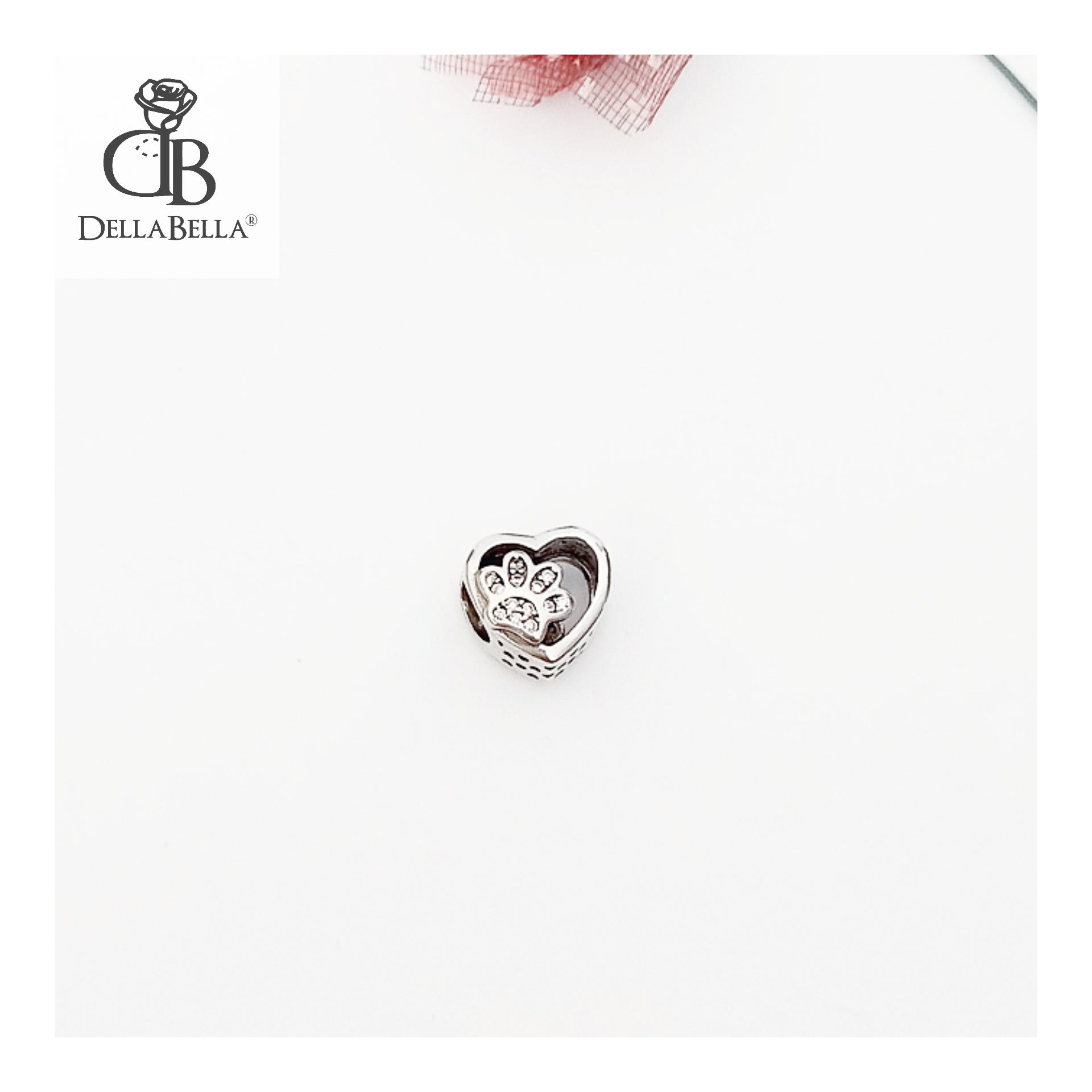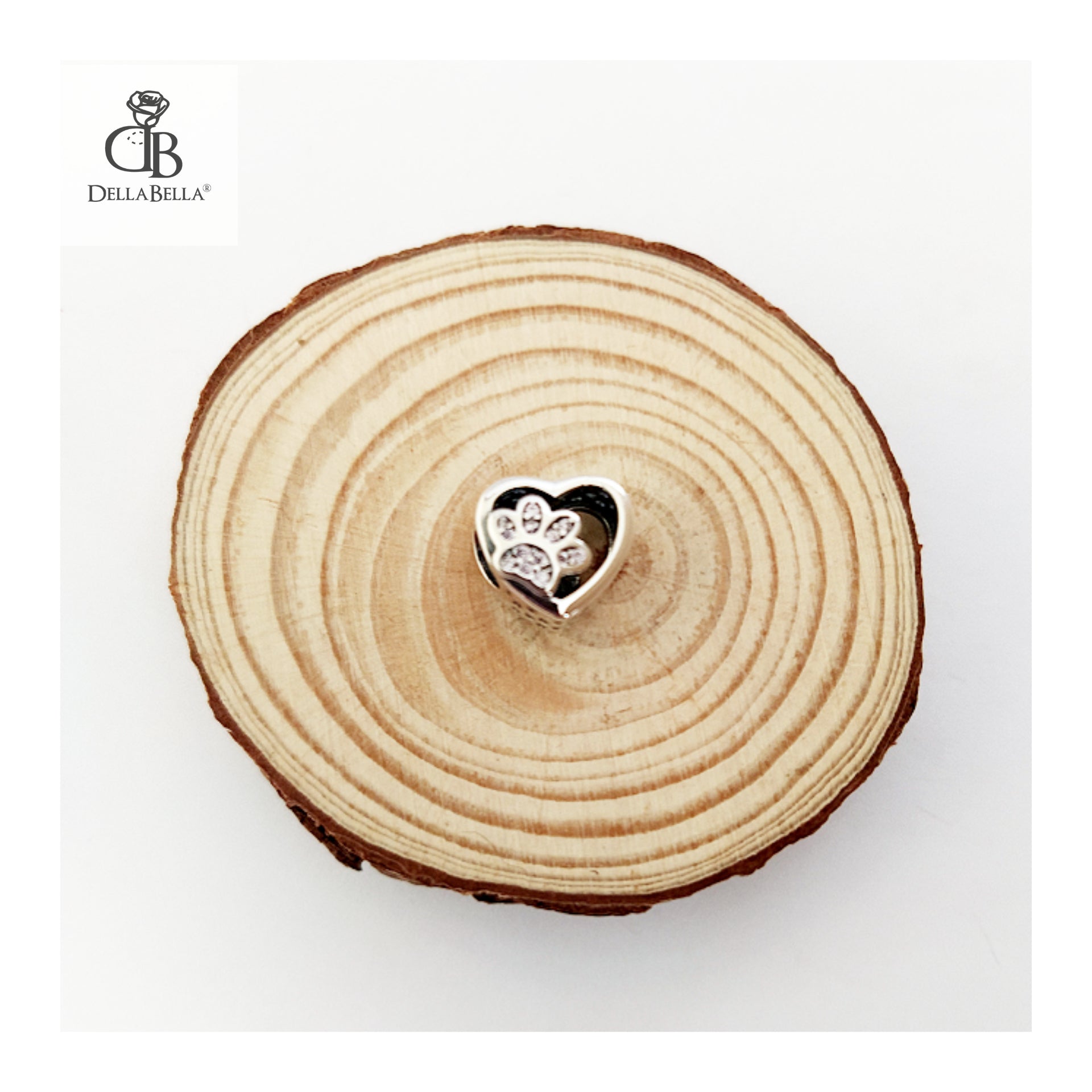 Precioso colgante charm en forma de corazón y una huella rosa de mascota en plata de ley, especial para pulsera charms o collar.