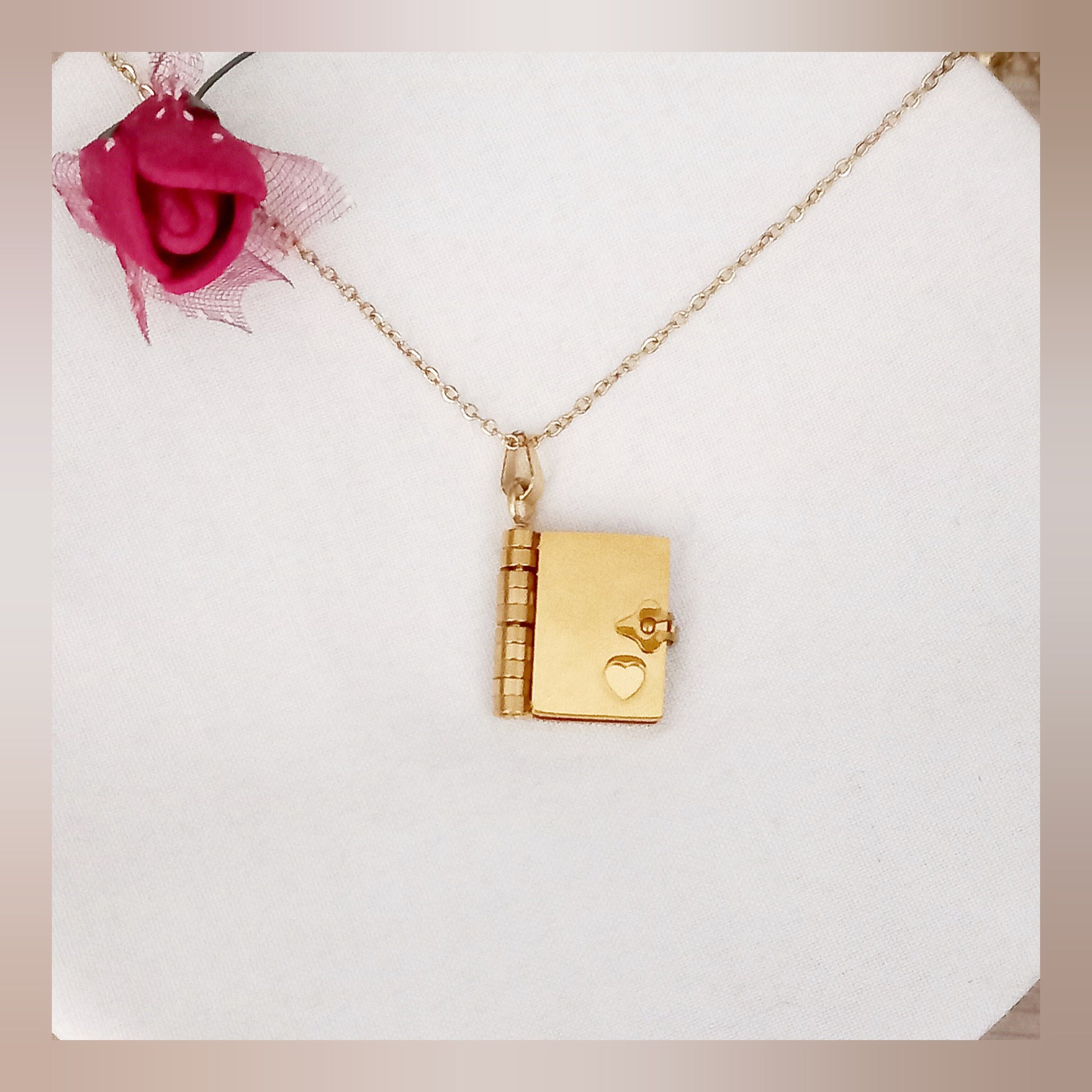 Un original collar en forma de libro con paginas en el interior para poder grabar lo que quieras y hacer un regalo especial a alguien, amiga, pareja, dama de honor, madres..