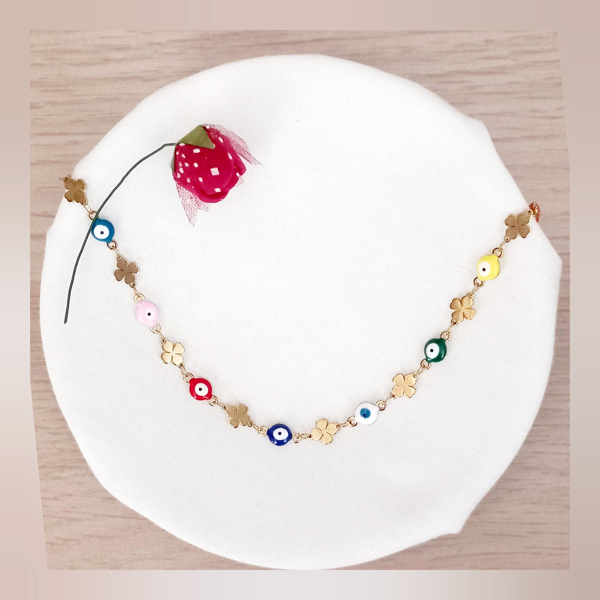 Un precioso y protector collar de ojos turcos de colores y tréboles de la suerte dorados en acero inoxidable baño oro para mujer.