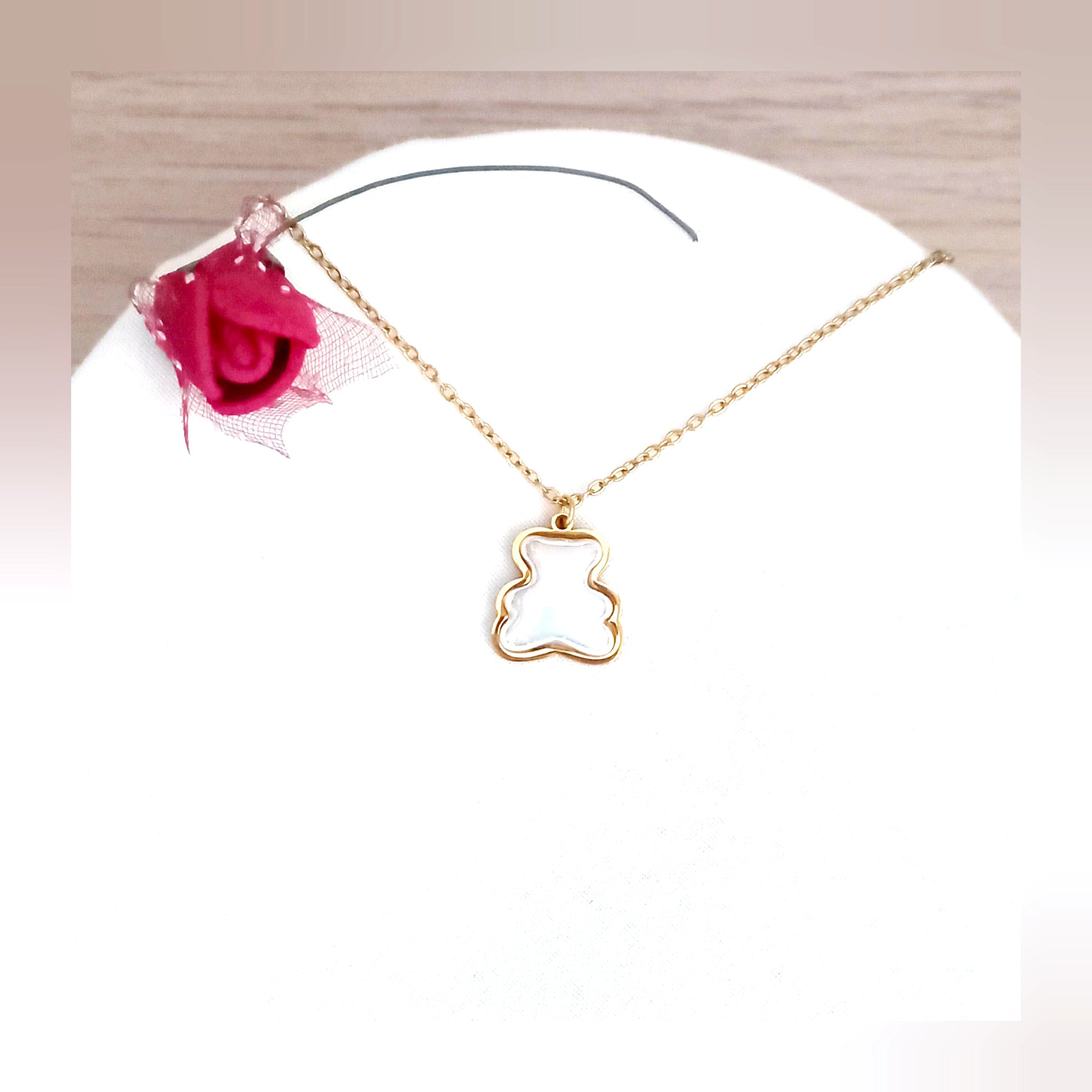 Collar con colgante de oso dorado y perla en acero inoxidable.