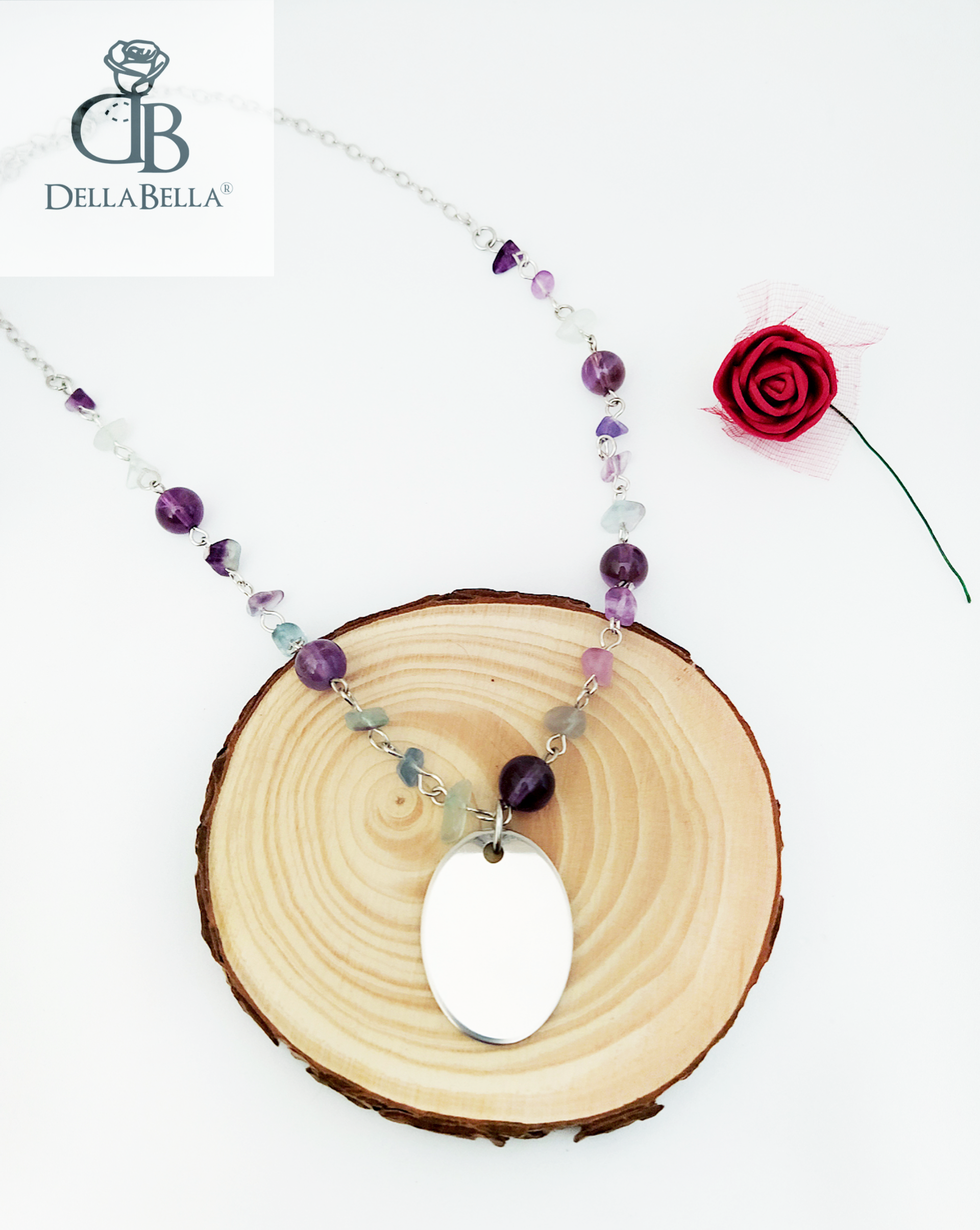 Precioso collar con cadena de acero, piedras preciosas en color lila y verde claro y placa para personalizar.