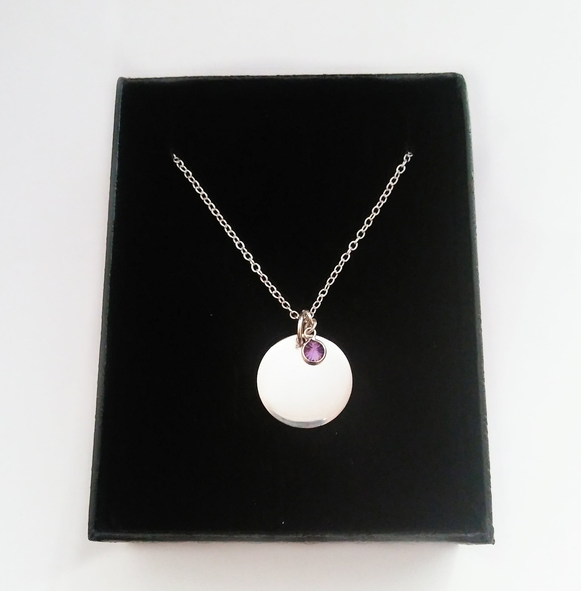 Collar que marca tendencia, placa de 18 mm con circonita en lila o roja para grabar la inicial o nombre en plata de ley.