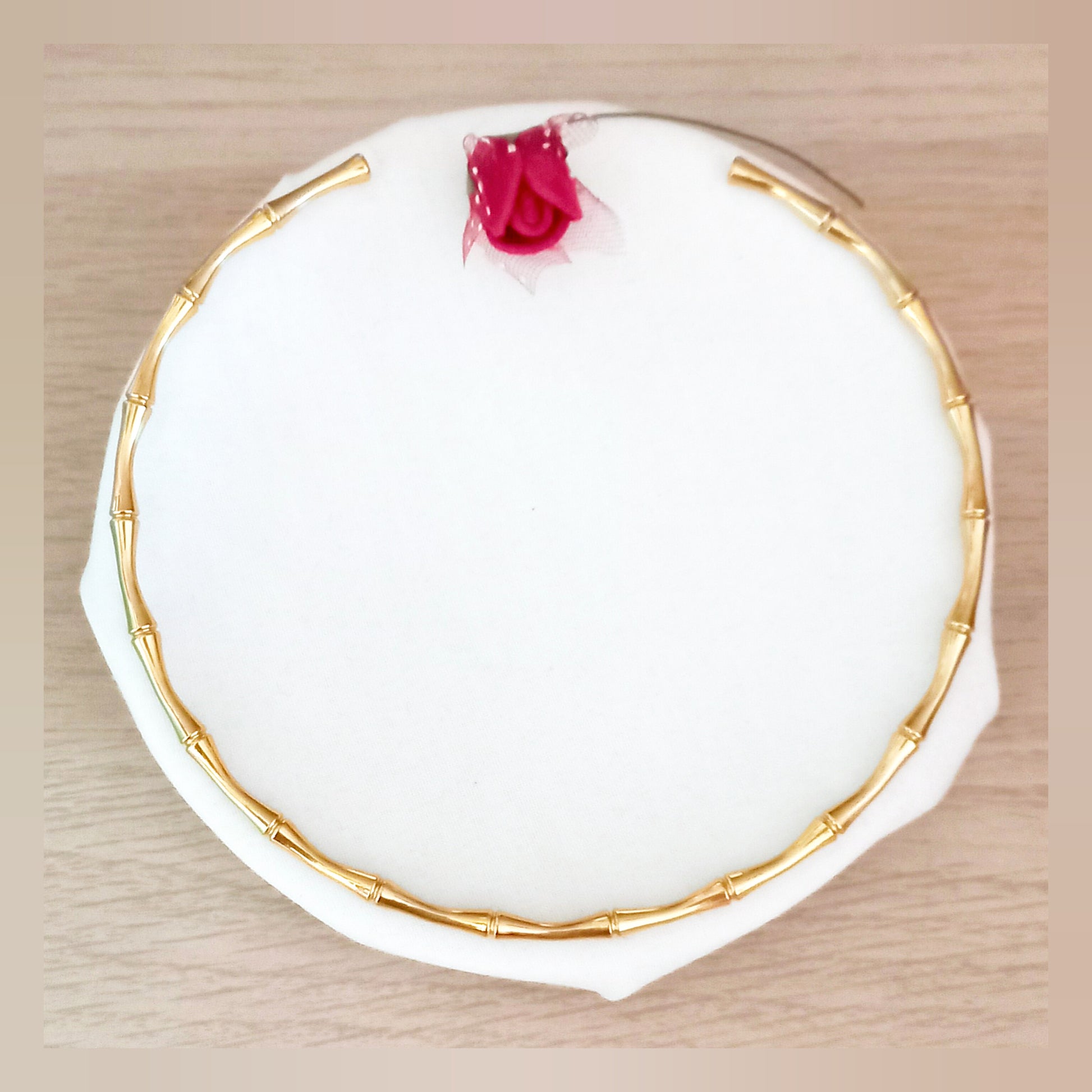 Un moderno collar rígido abierto y ajustable en forma de bambú de acero inox, dorado para mujer.