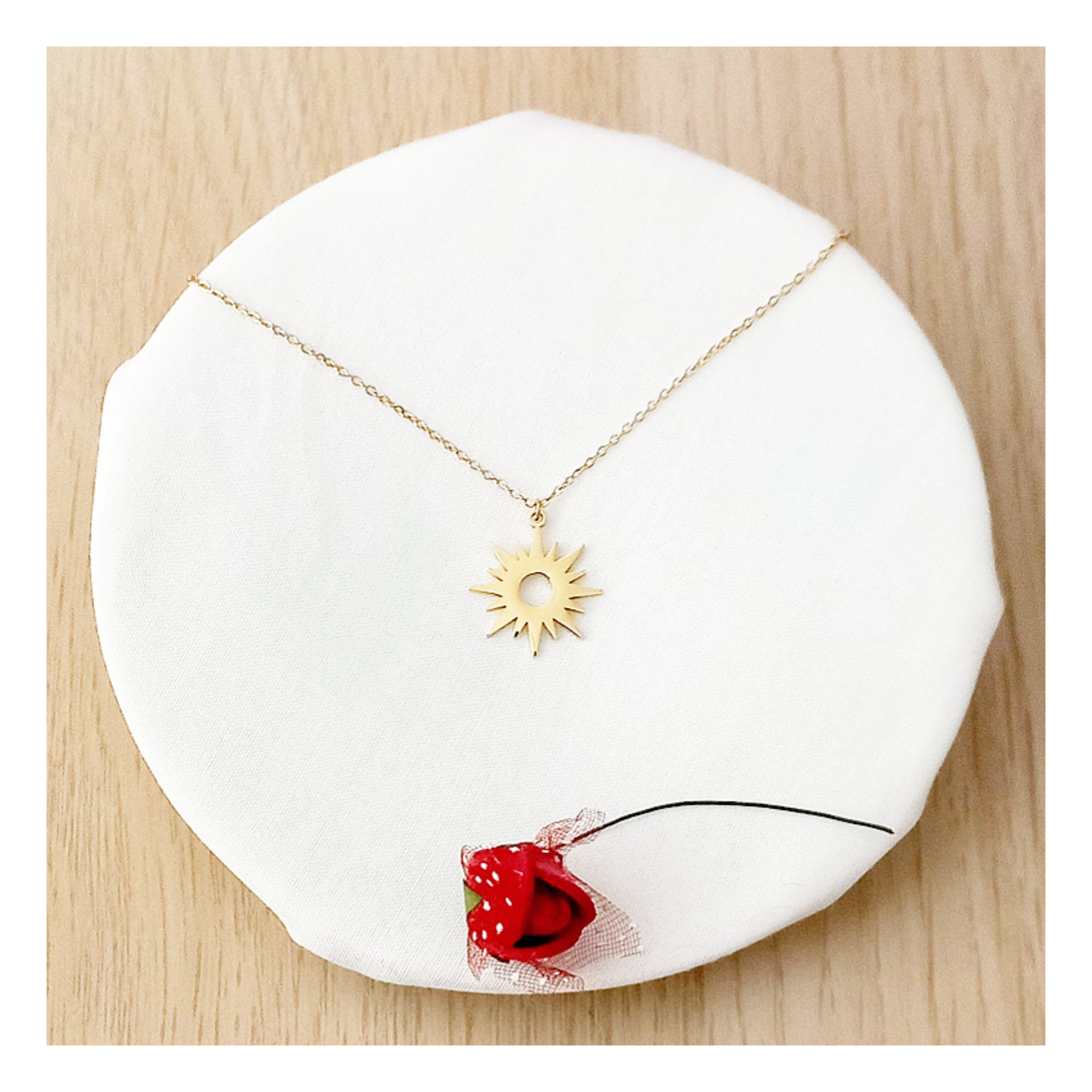 Un bonito collar con el colgante del sol calado en acero baño dorado.
