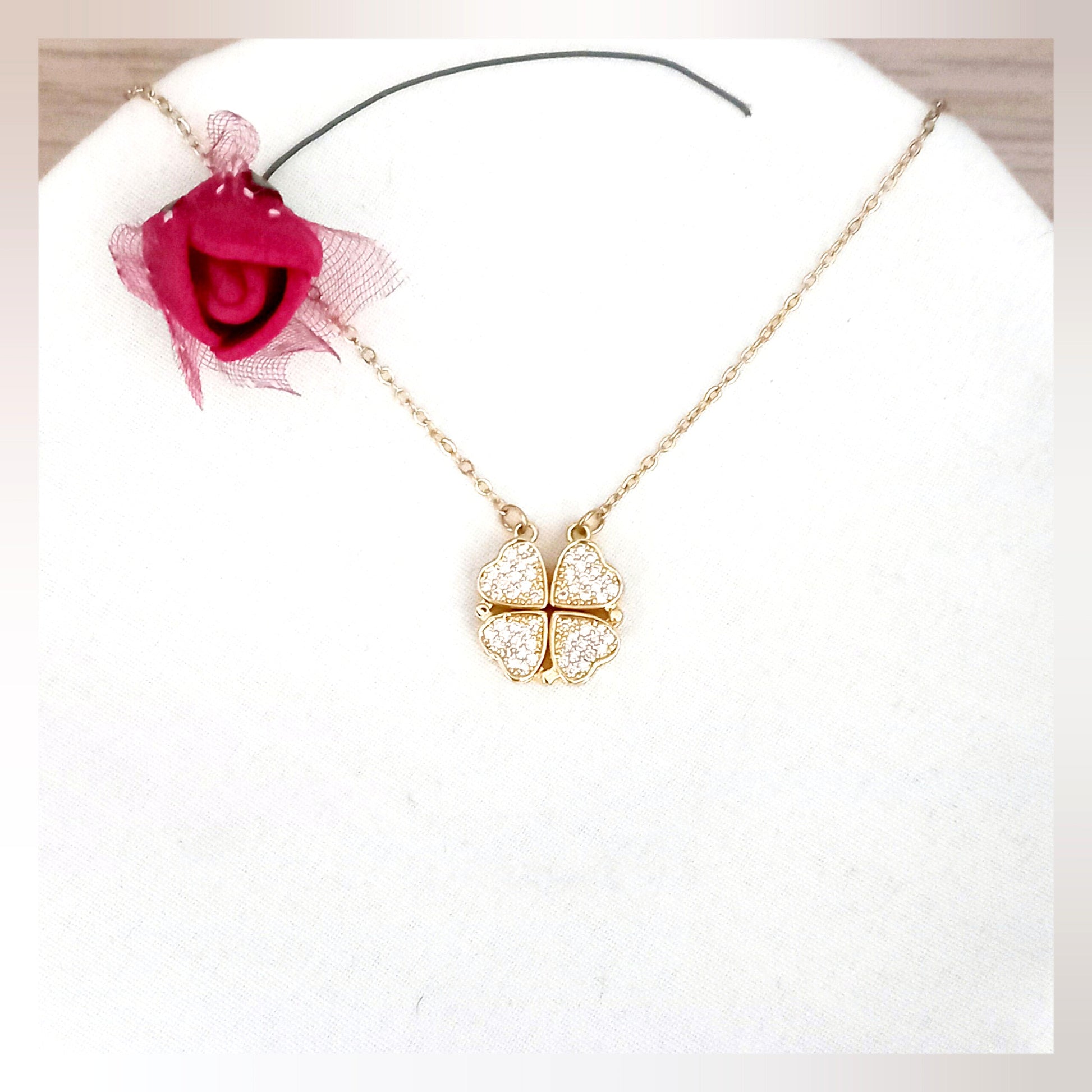 Un bonito collar en forma de trébol brillante con imán que se abre y puedes llevarlo en forma de corazones. Acero inoxidable con baño oro para mujer.