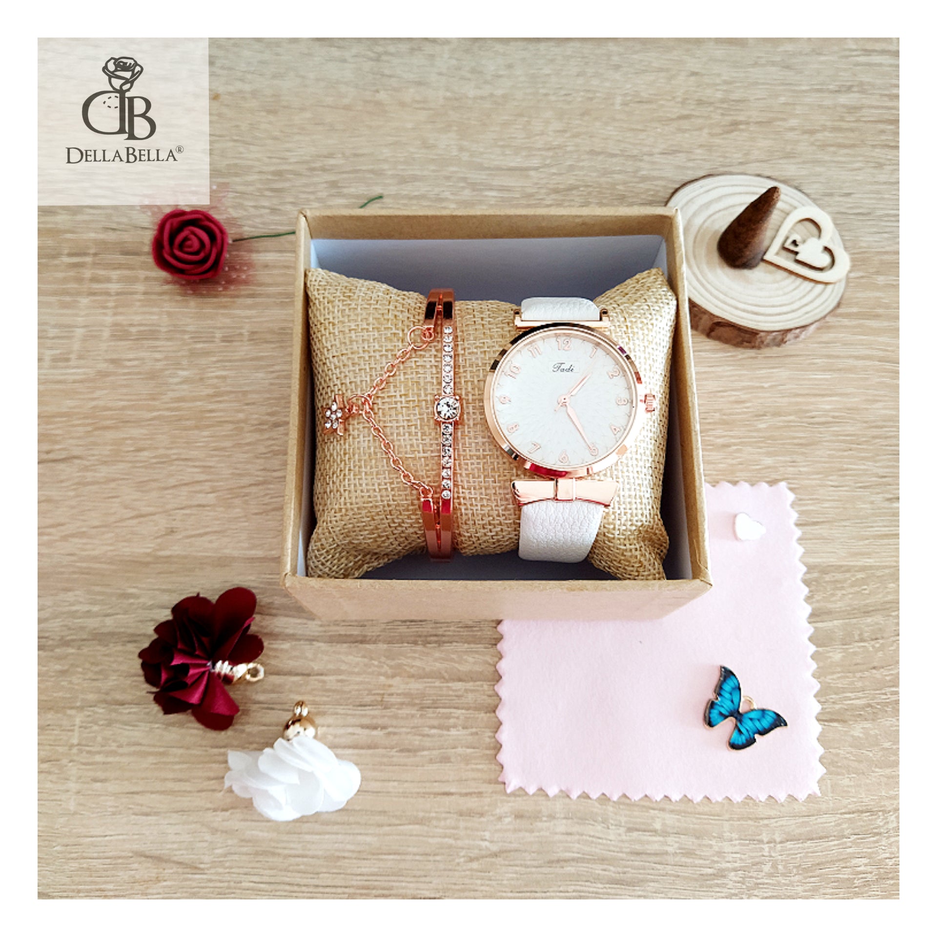 Conjunto reloj con correa de cuero y esfera en color dorada más pulsera rígida de cristales en color oro rosa.