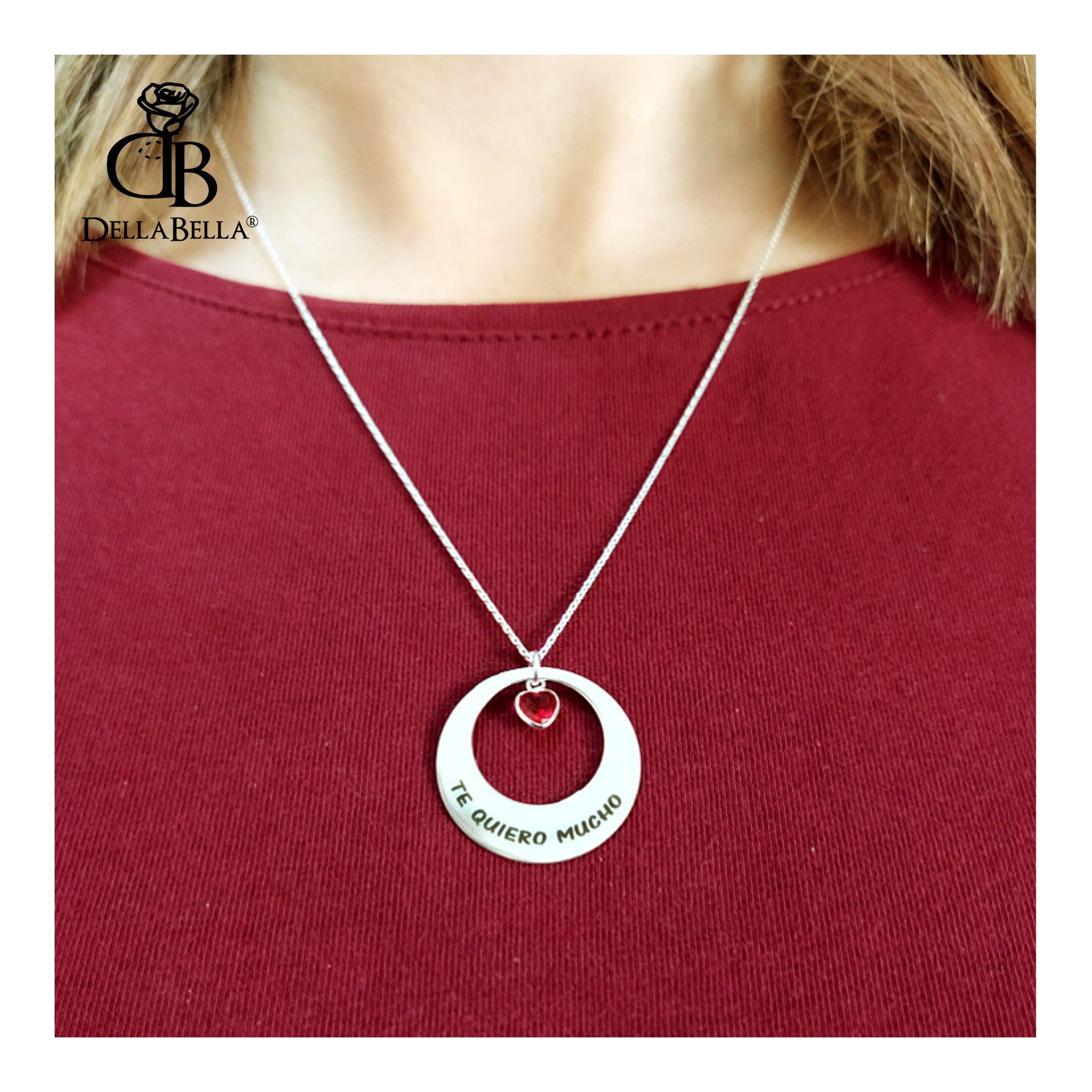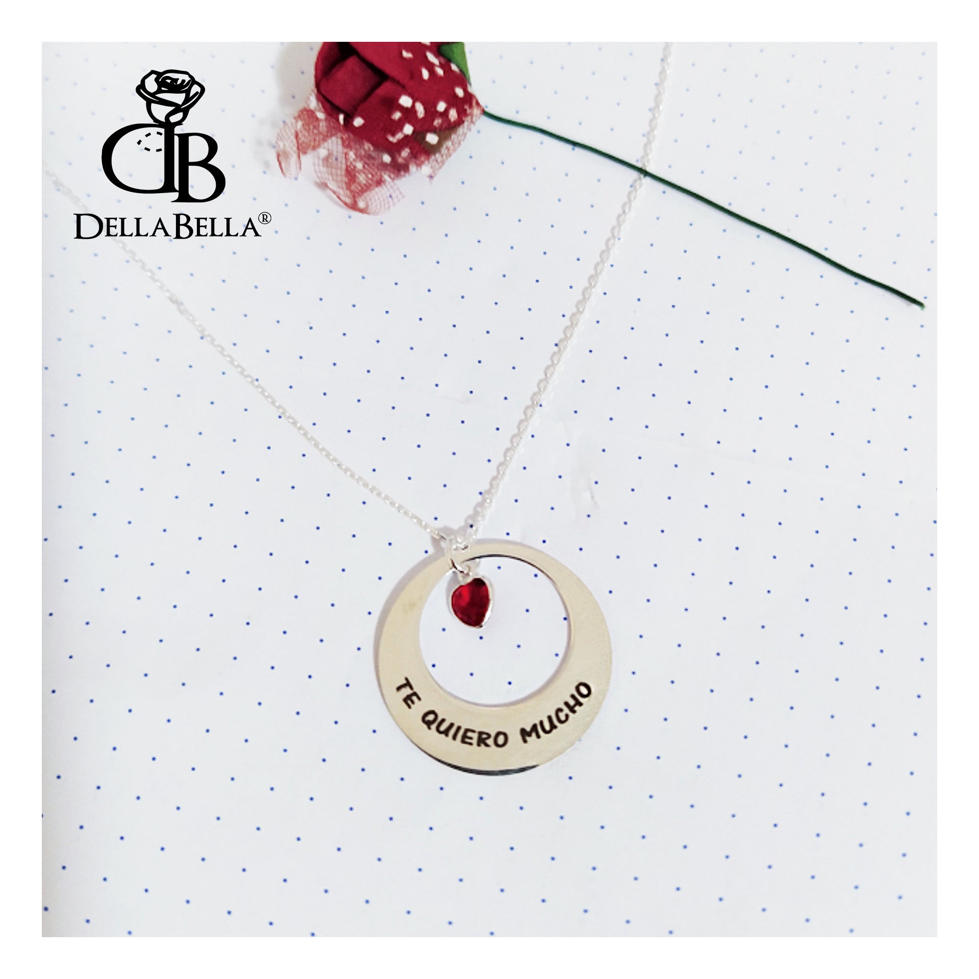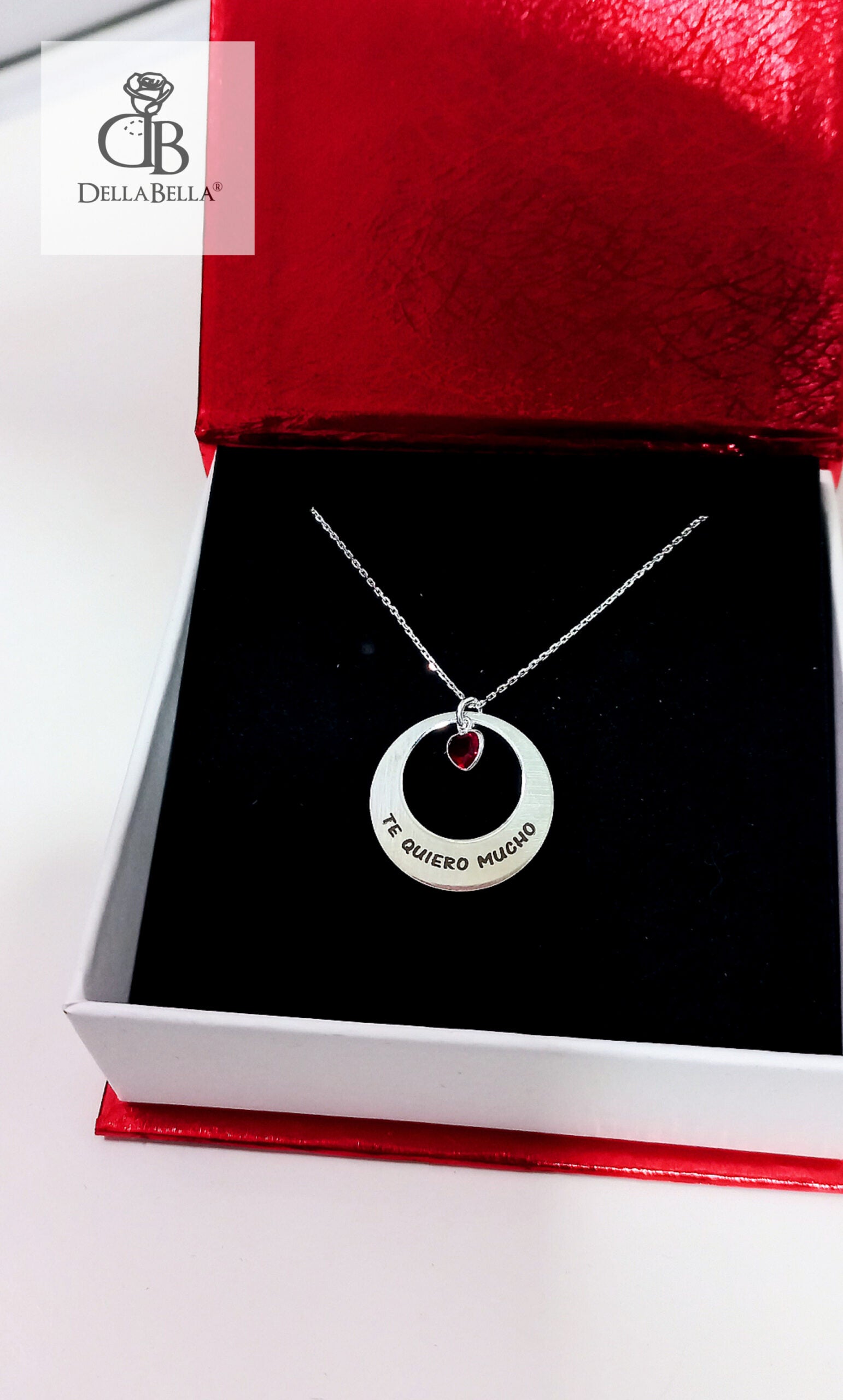Preciosa gargantilla con colgante circular, frase `` Te quiero mucho´´ y colgante corazón de cristal en color rojo. Plata de ley.