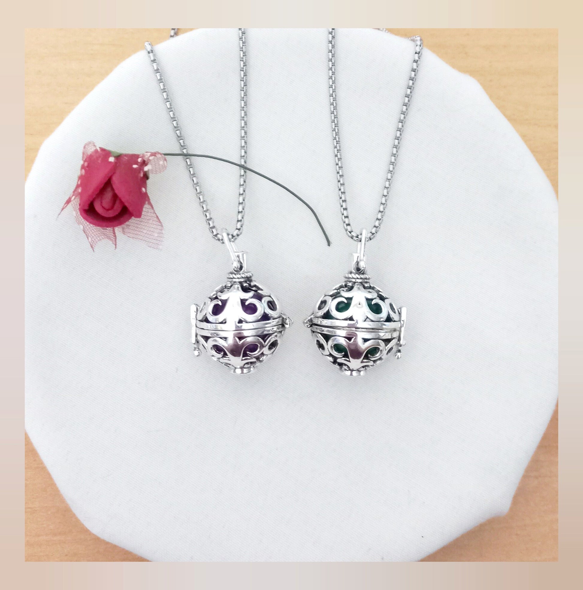 Cadena larga de acero inox. 60cm de con colgante llamador de ángel con bolita de color y posibilidad de abrir. Ideal para regalar a una embarazada o llevarlo tu misma para que te protejan los ángeles.