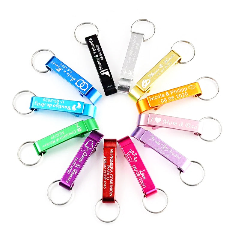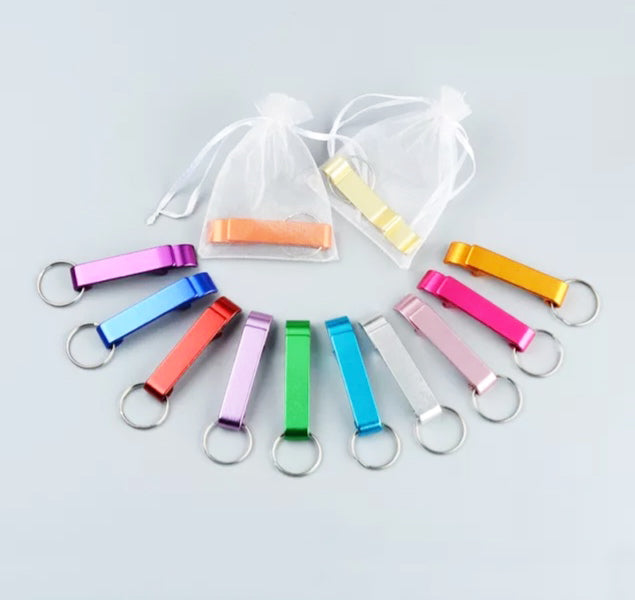 Llaveros de abrebotellas personalizados de varios colores en metal para regalar a tus invitados + bolsita de tela en blanco.