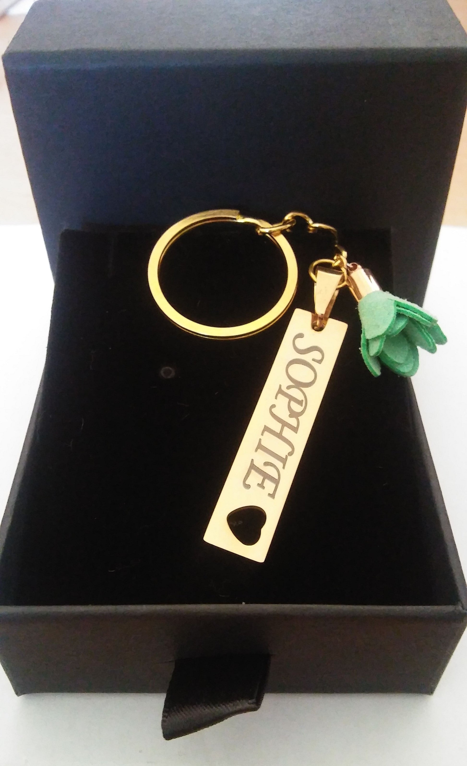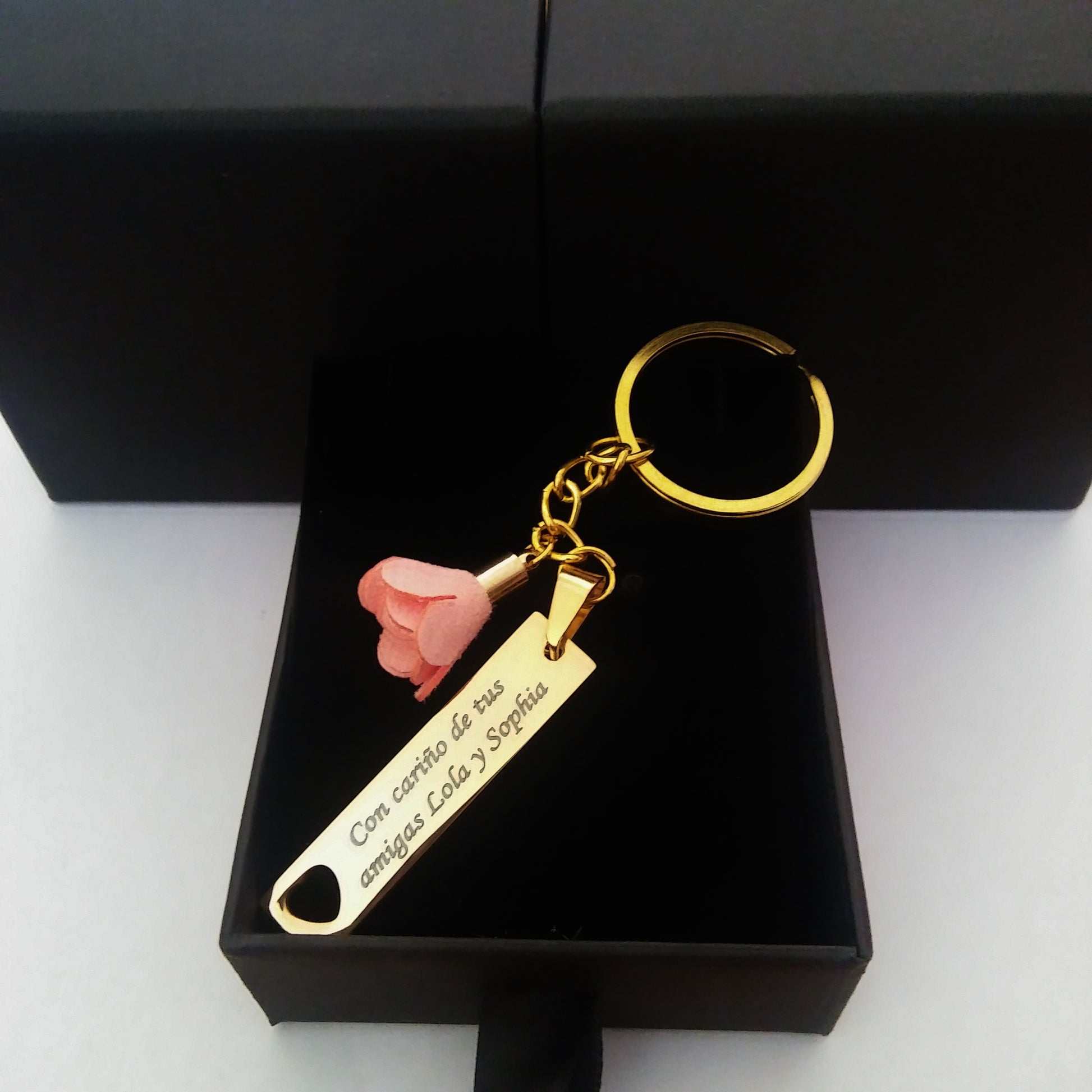 Llavero de acero inoxidable bañado en oro con placa rectangular para grabar el nombre o frase que quieras.