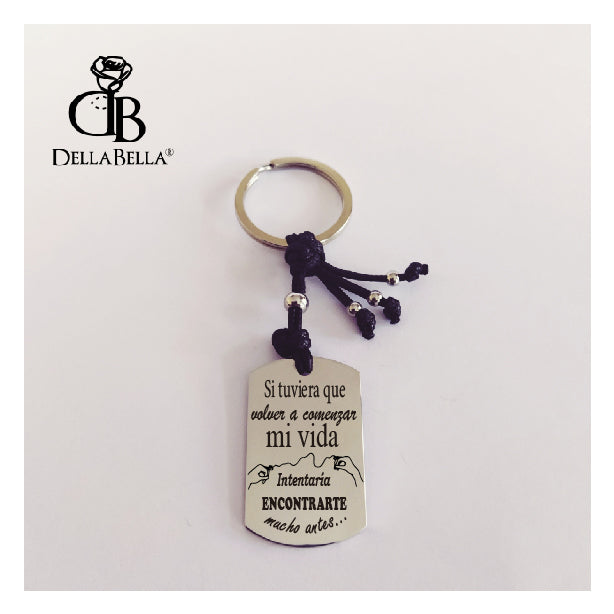 Bonito llavero con placa rectangular para personalizar, hilo negro y bolitas en acero inoxidable. Unisex.