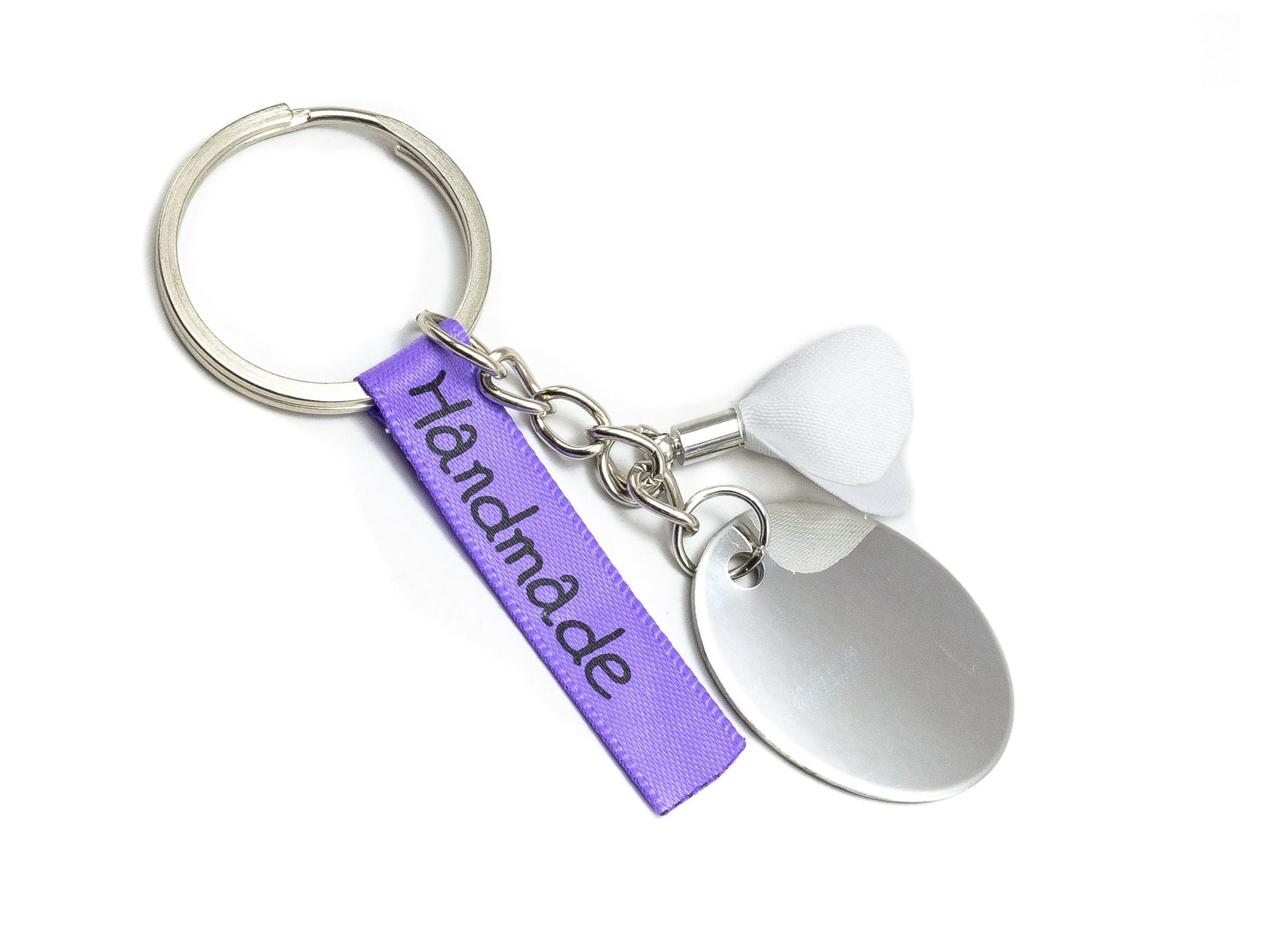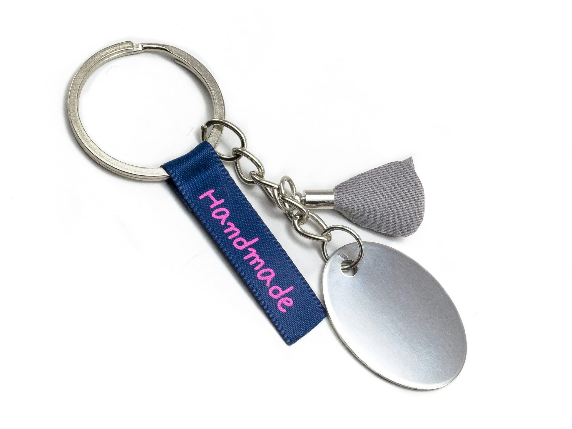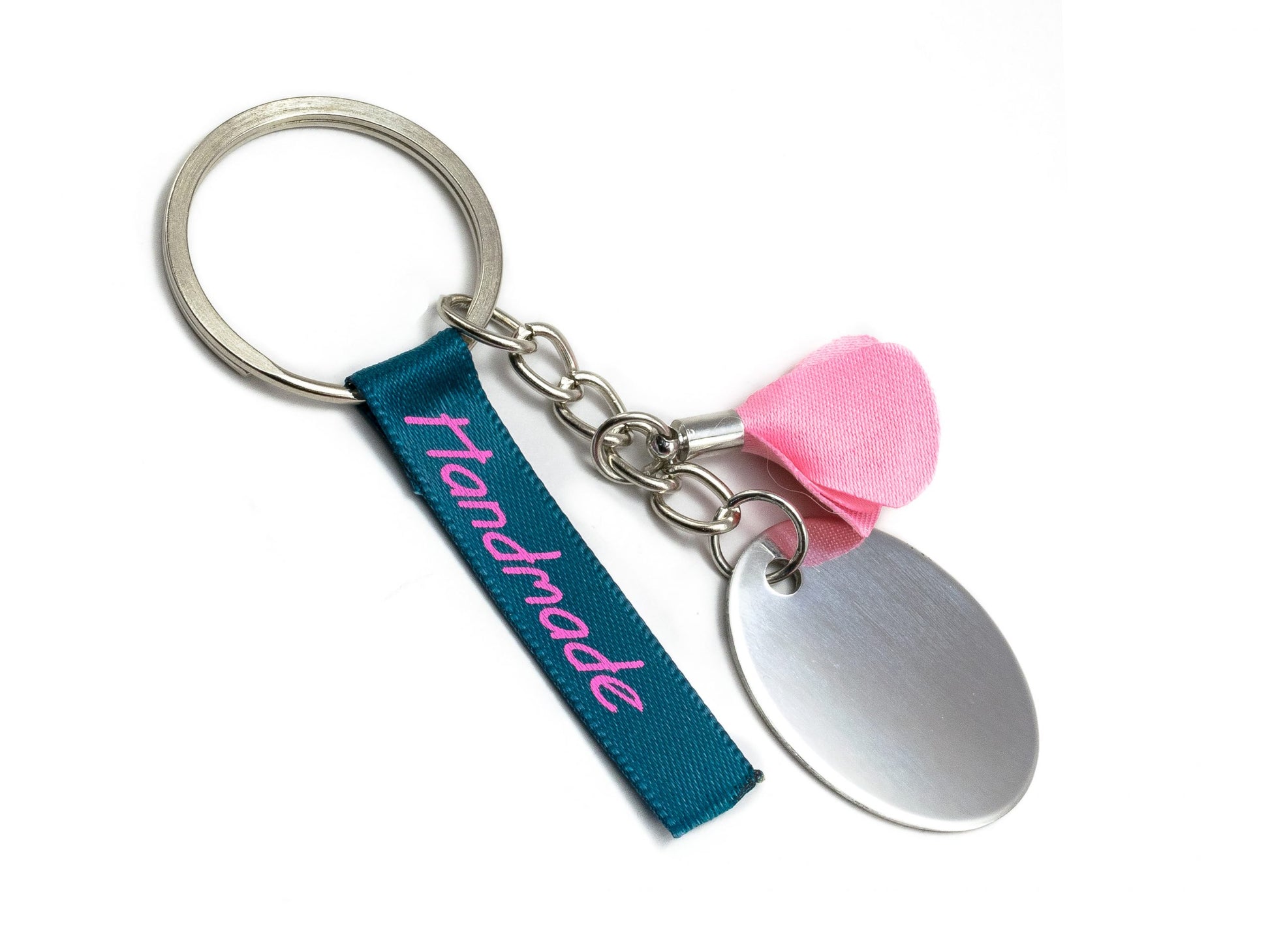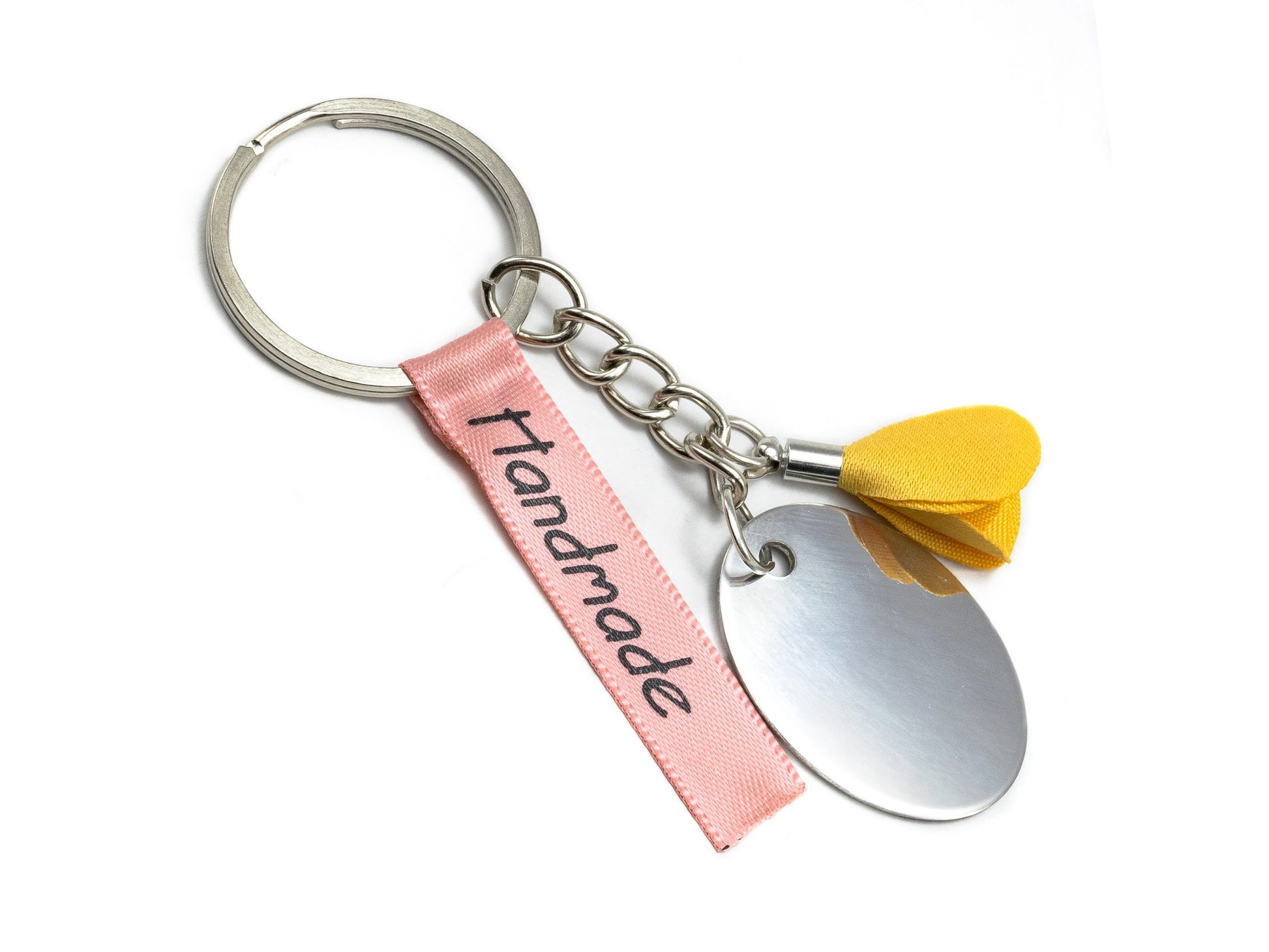 Llavero hecho a mano con placa ovalado en acero inoxidable y lacito más una flor colgando.