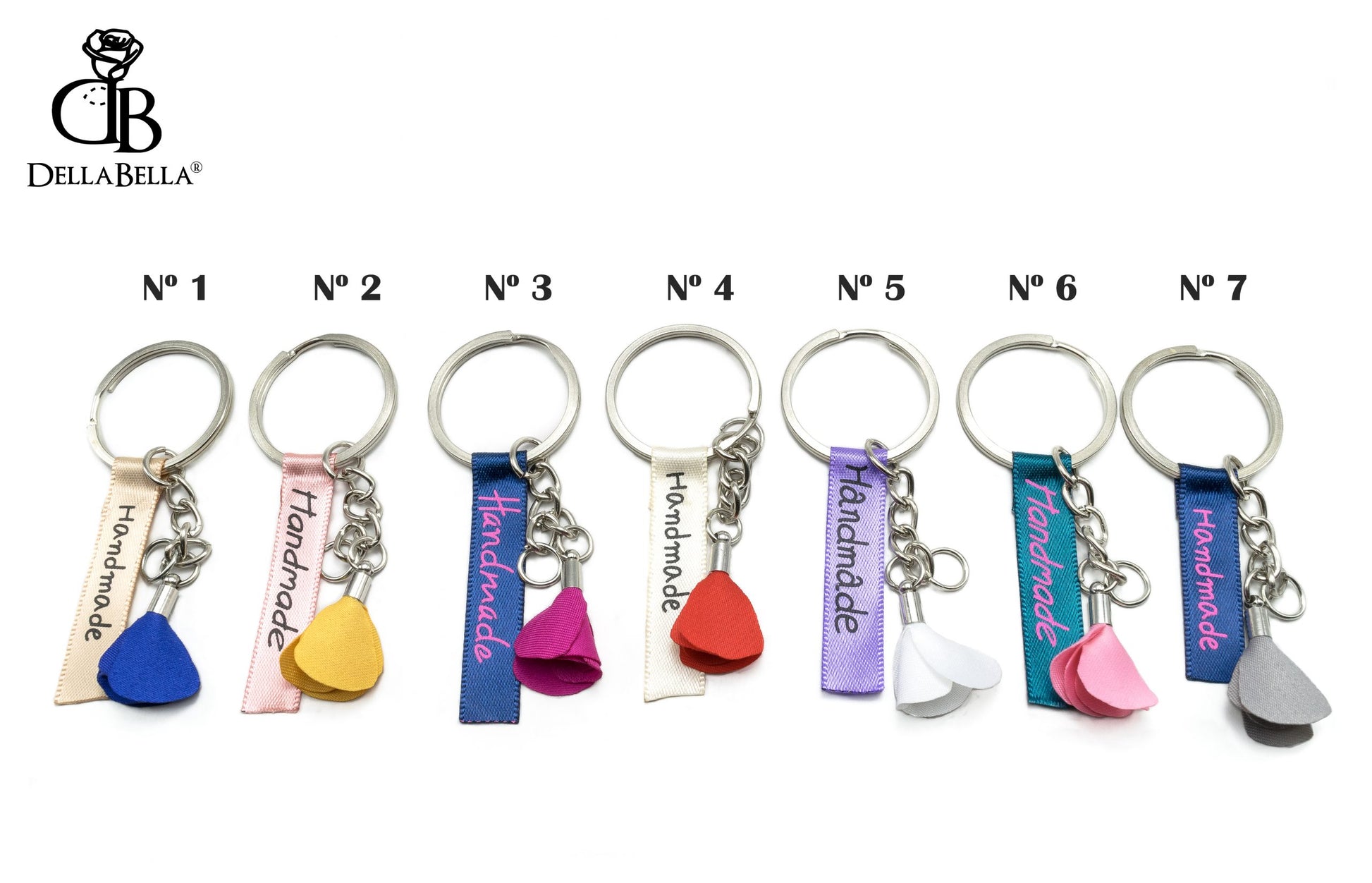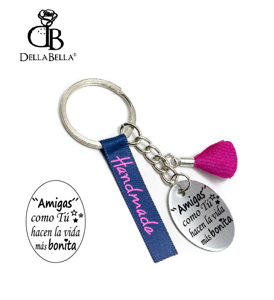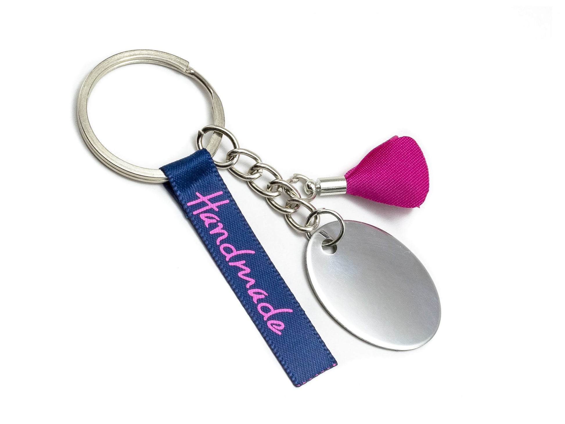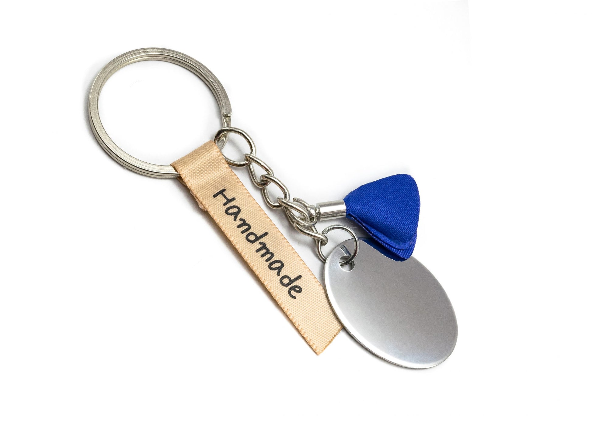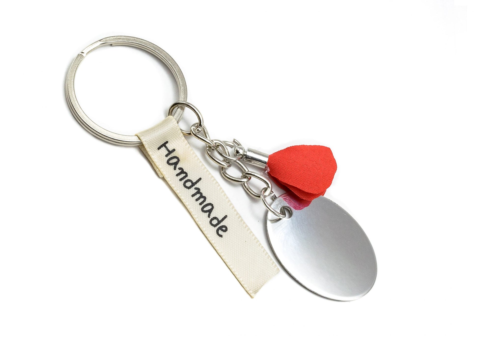 Llavero hecho a mano con placa ovalado en acero inoxidable y lacito más una flor colgando.