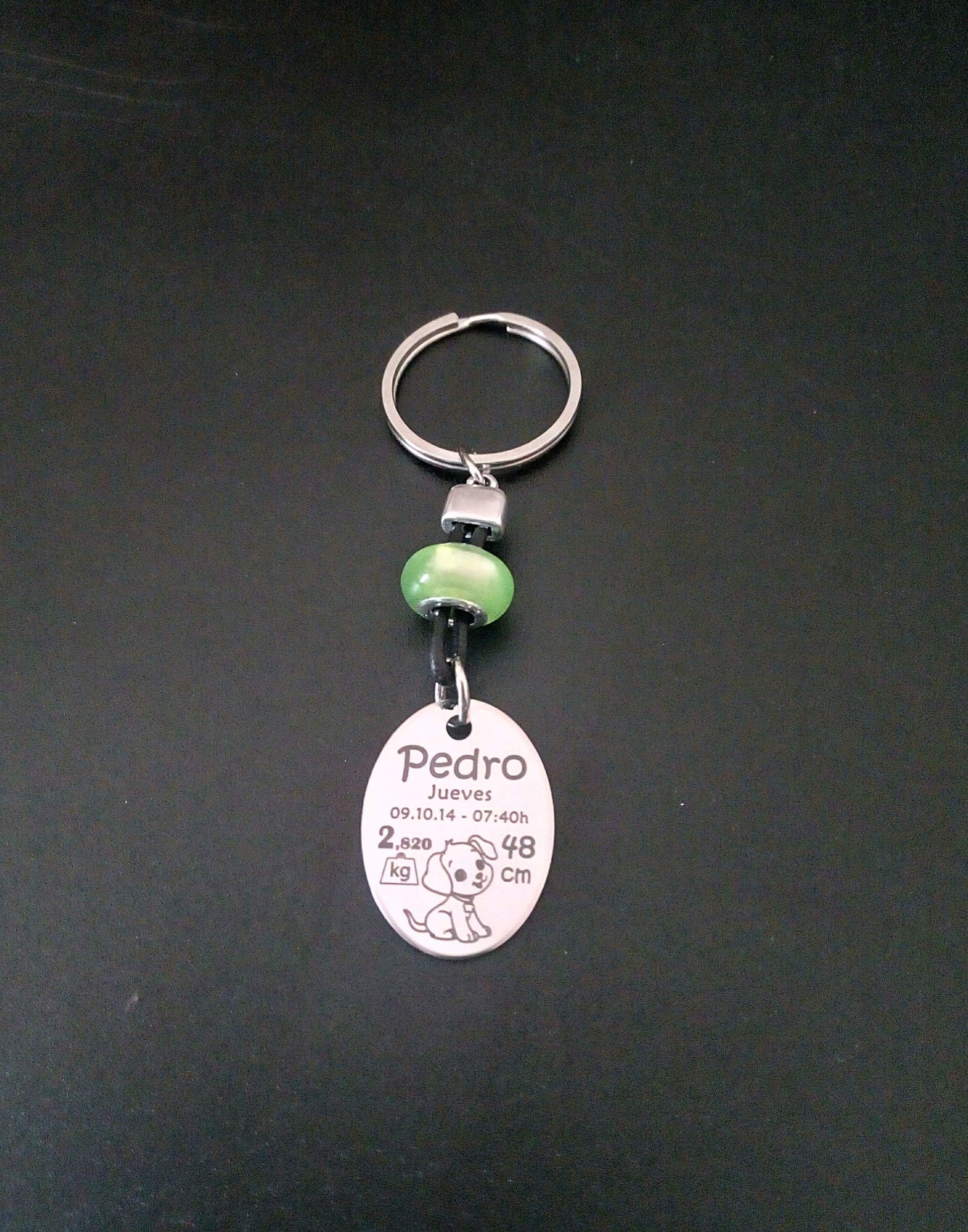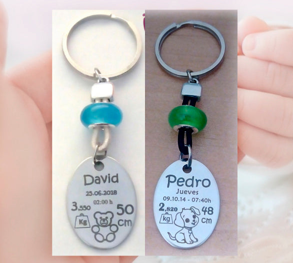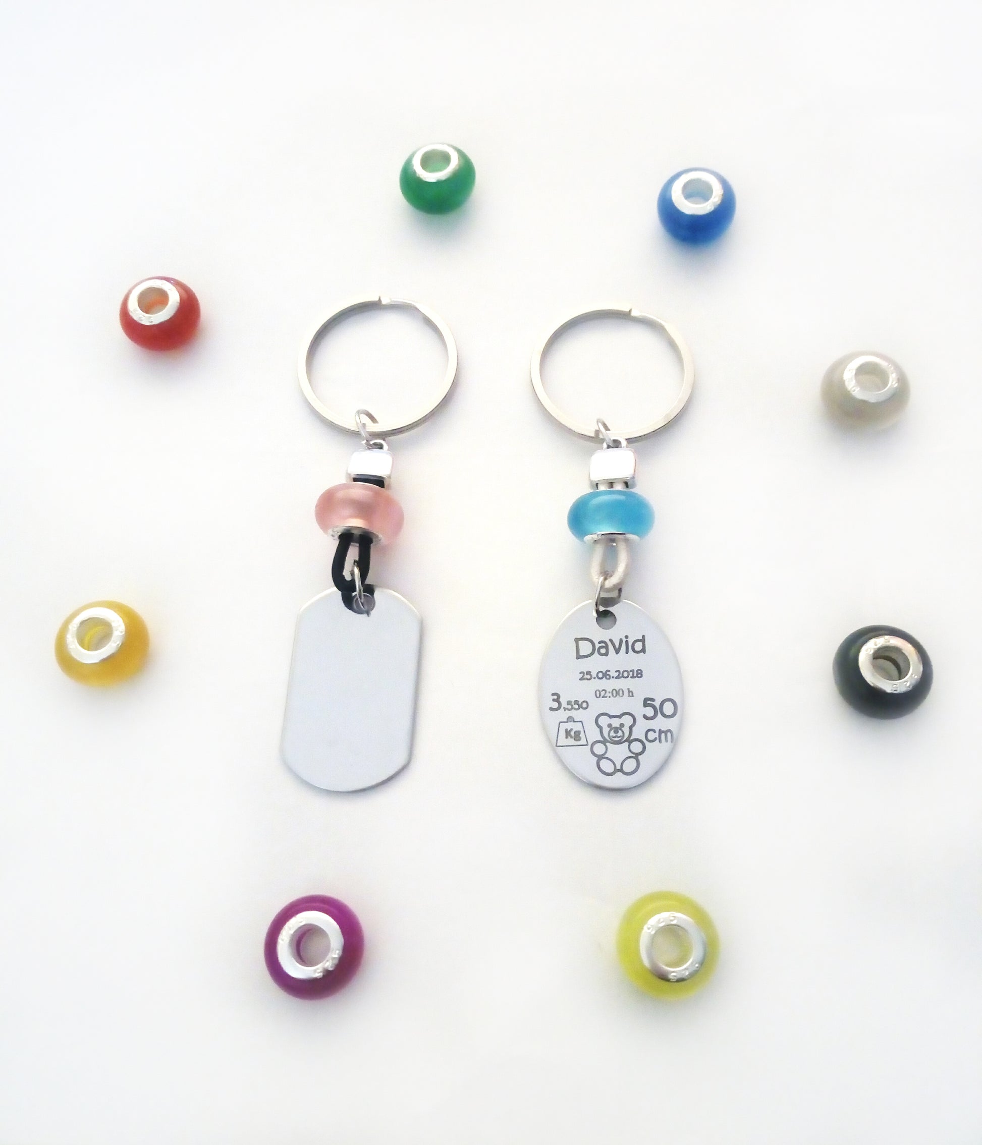 Llavero natalicio para personalizar con una chapa de acero inoxidable en forma ovalada o rectangular, cuerda de cuero negro o blanca y una bolita de resina a elegir el color.