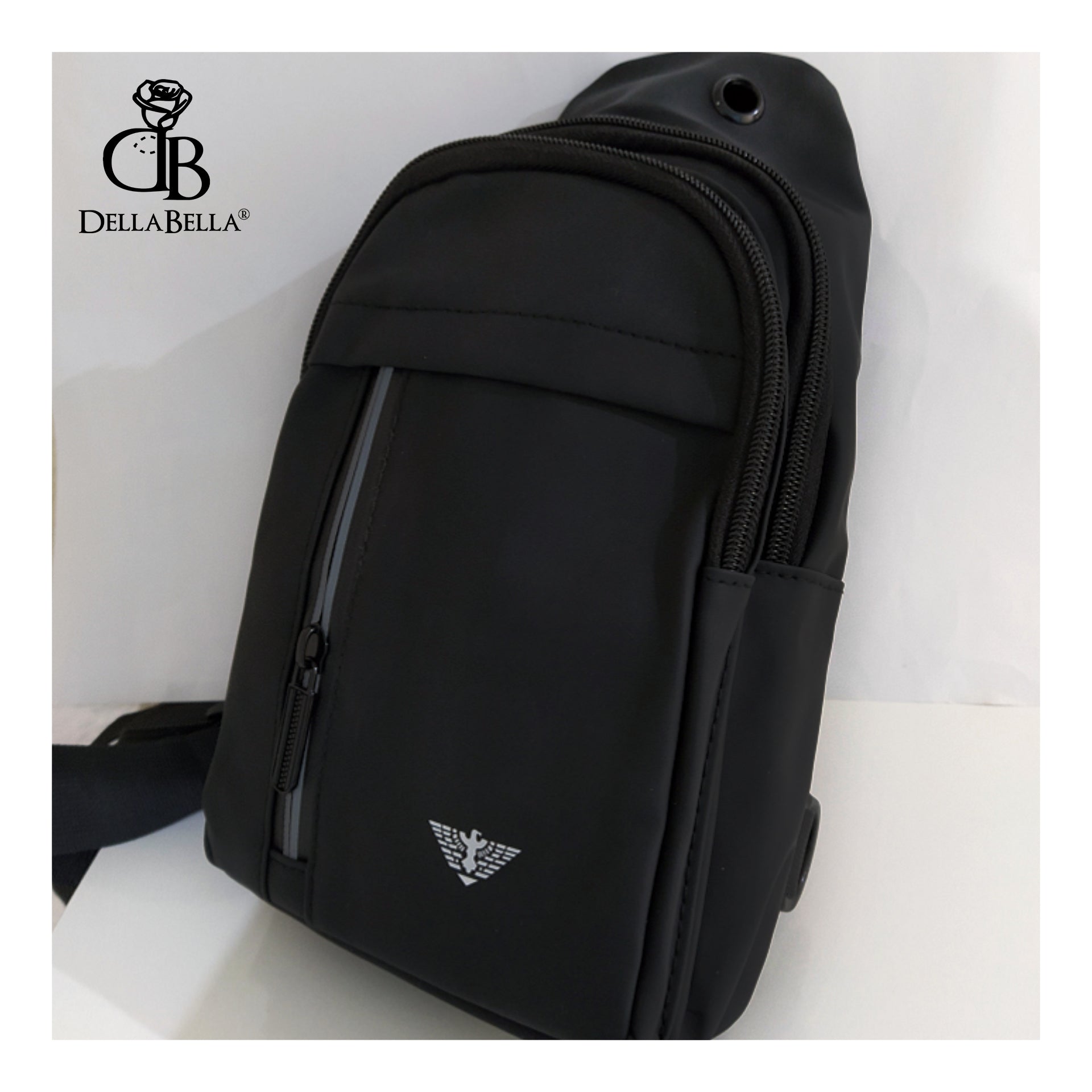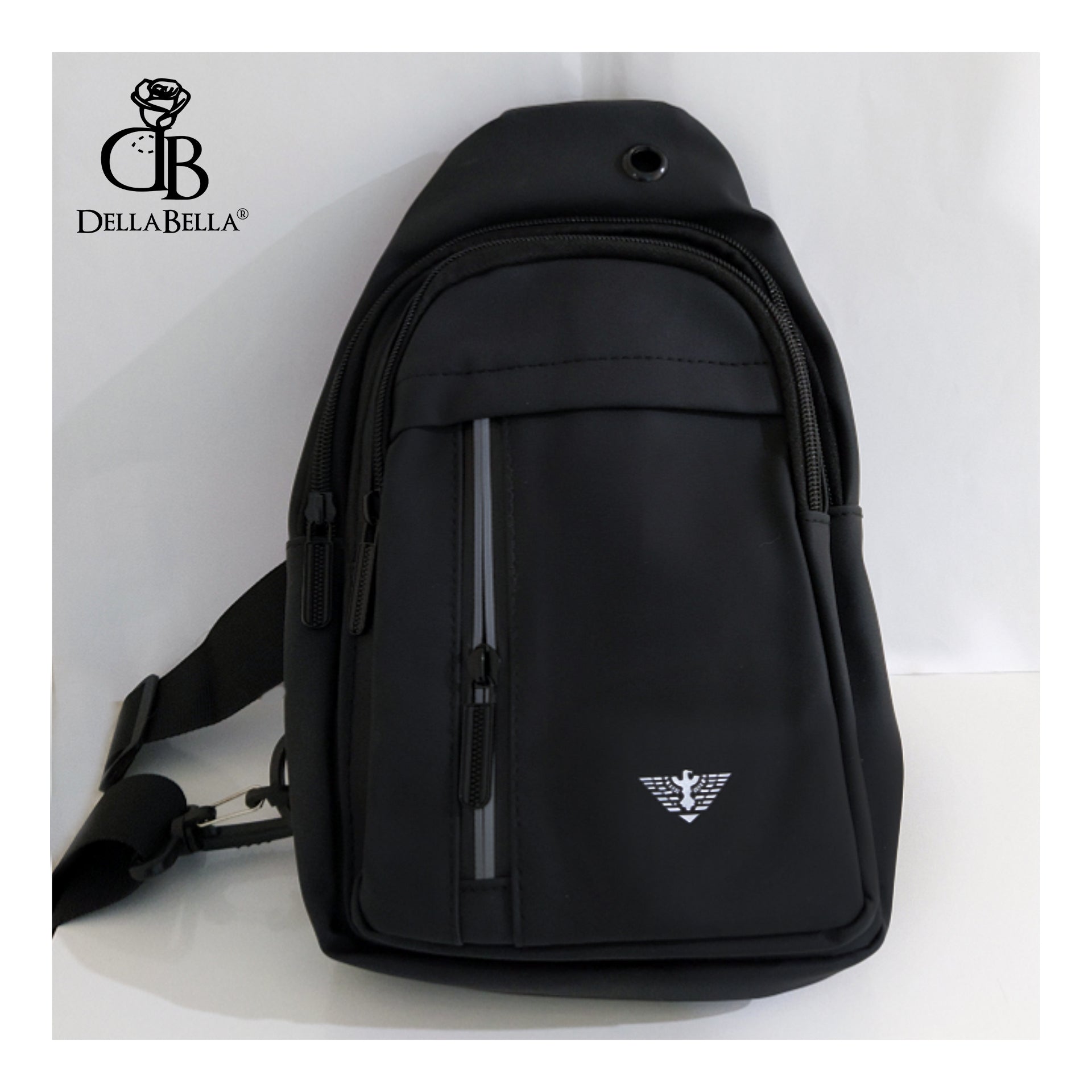 Mochila-bandolera cruzada de polipiel negra con varios bolsillos por fuera y uno en el interior.
