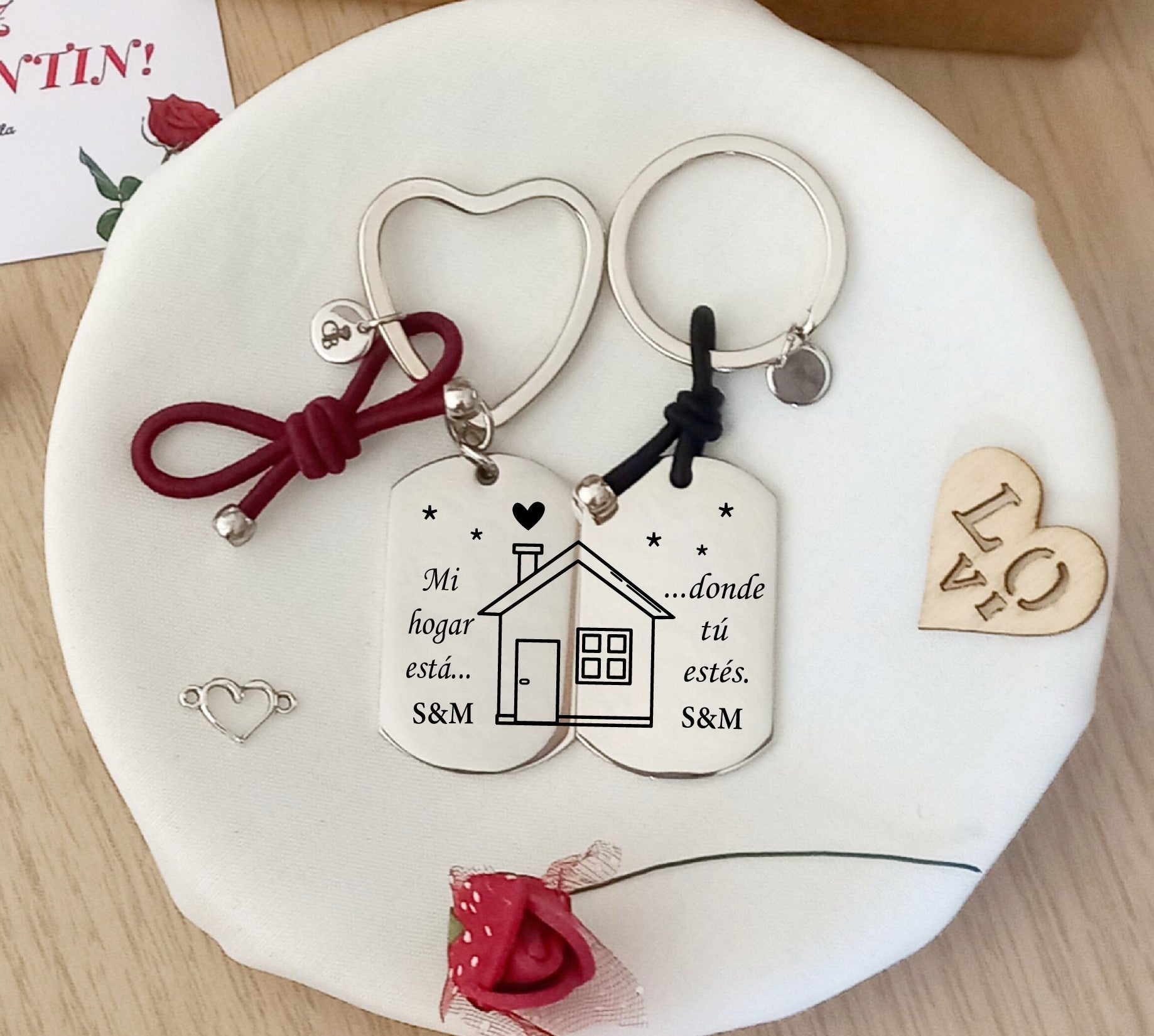 Oferta especial enamorados, 2 llaveros en acero inoxidable personalizados con frase ``Mi hogar está donde tú estés´´ y por detrás, grabado de vuestra fecha de aniversario y nombres.