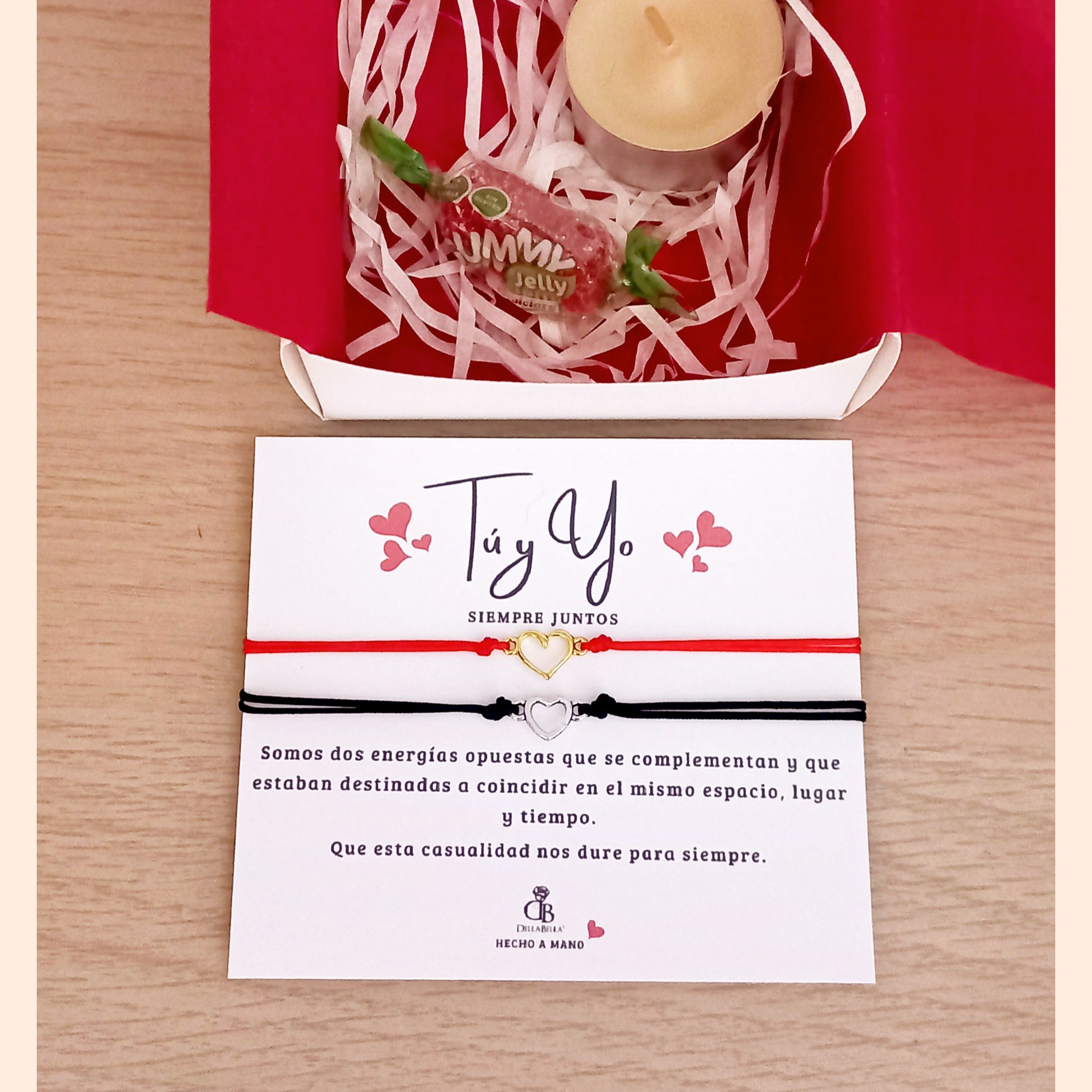 Un bonito regalo de San Valentín especial para parejas. Contiene una cajita con una tarjeta, 2 pulseras de cuerda con pieza de corazón en el centro, una velita olor a vainilla y una gominola.
