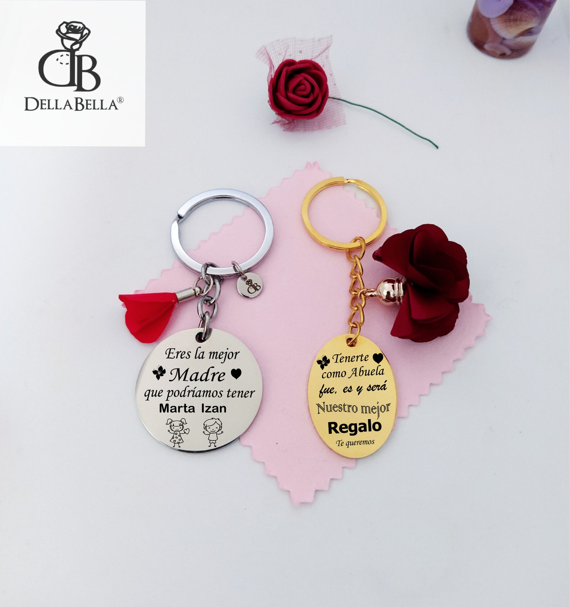 Pack de dos llaveros personalizados en acero con colgante de flores, uno para mamá y otro para abuela.