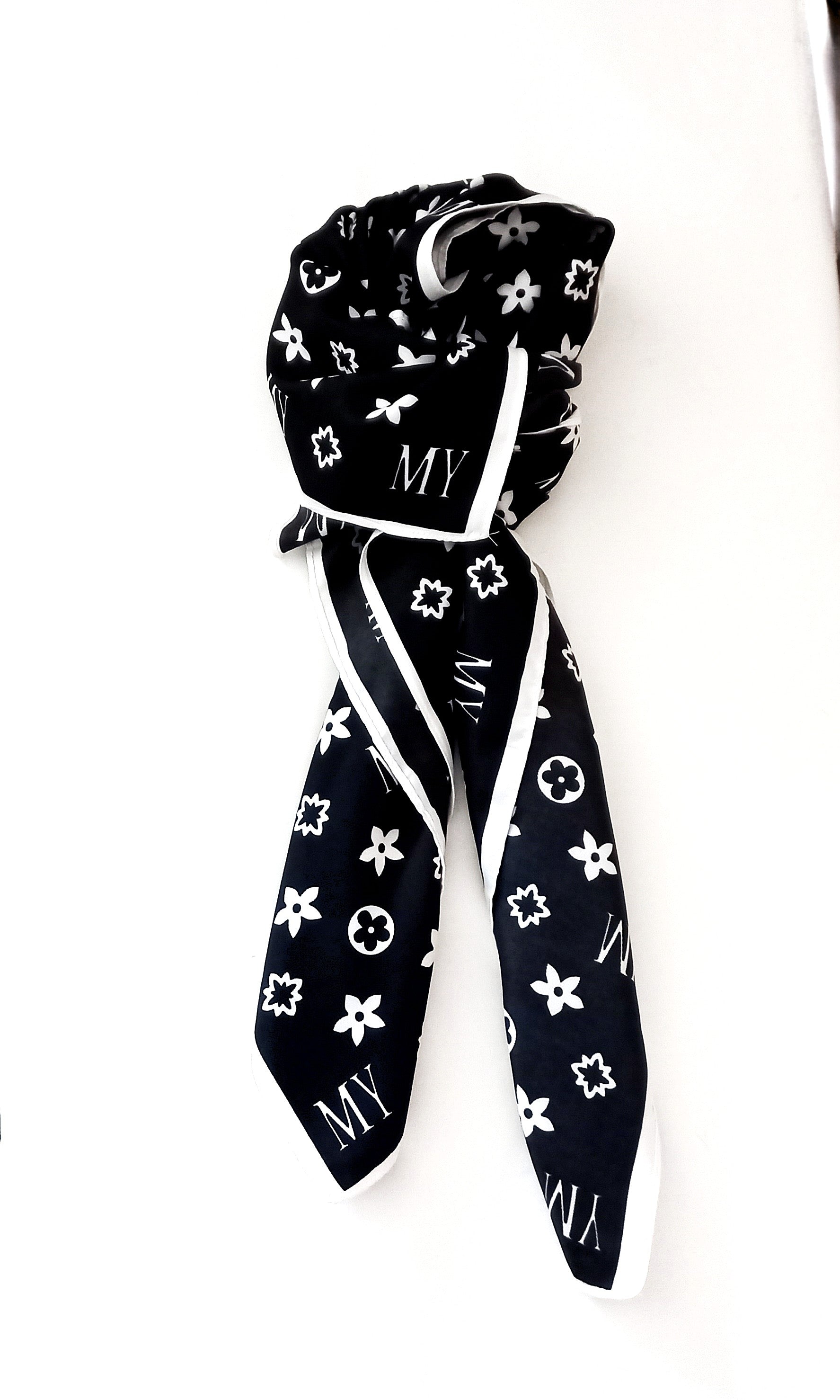 Pañuelo elegante fino de viscosa y seda con dibujos de tréboles y flores en blanco y negro para mujer.