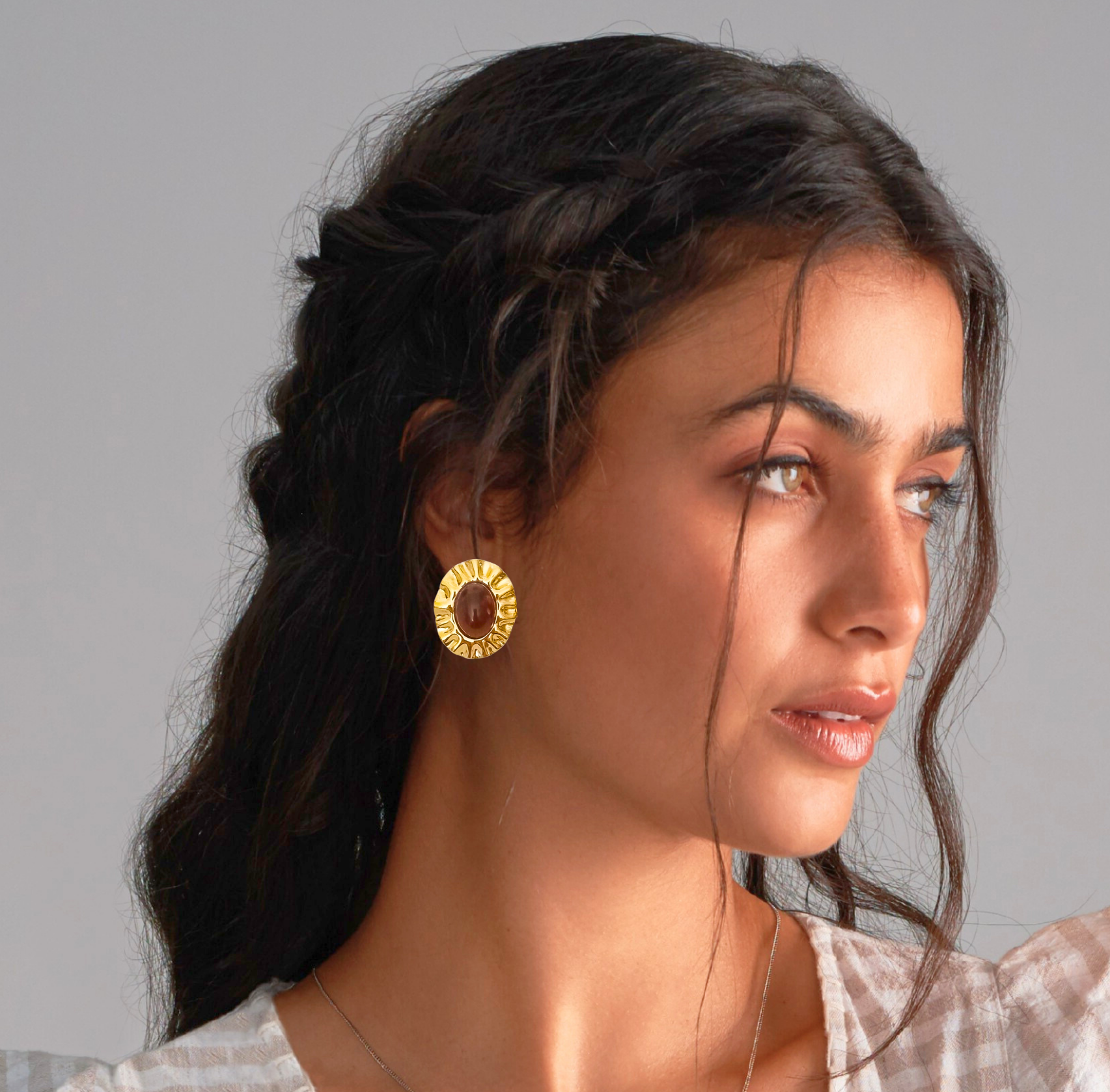 Unos preciosos pendientes redondos de acero dorado con piedra en el centro marrón y cierre tuerca normal para mujer.