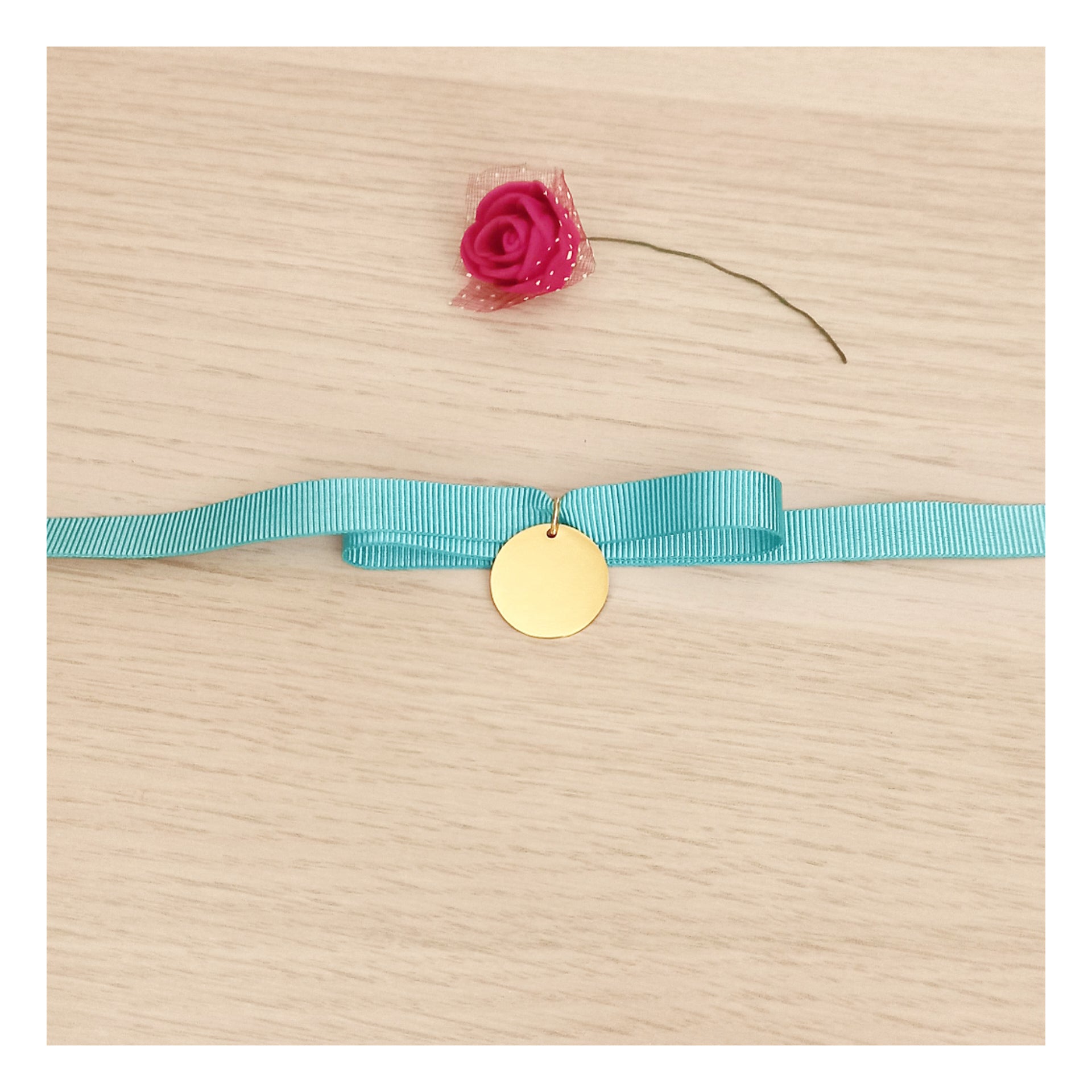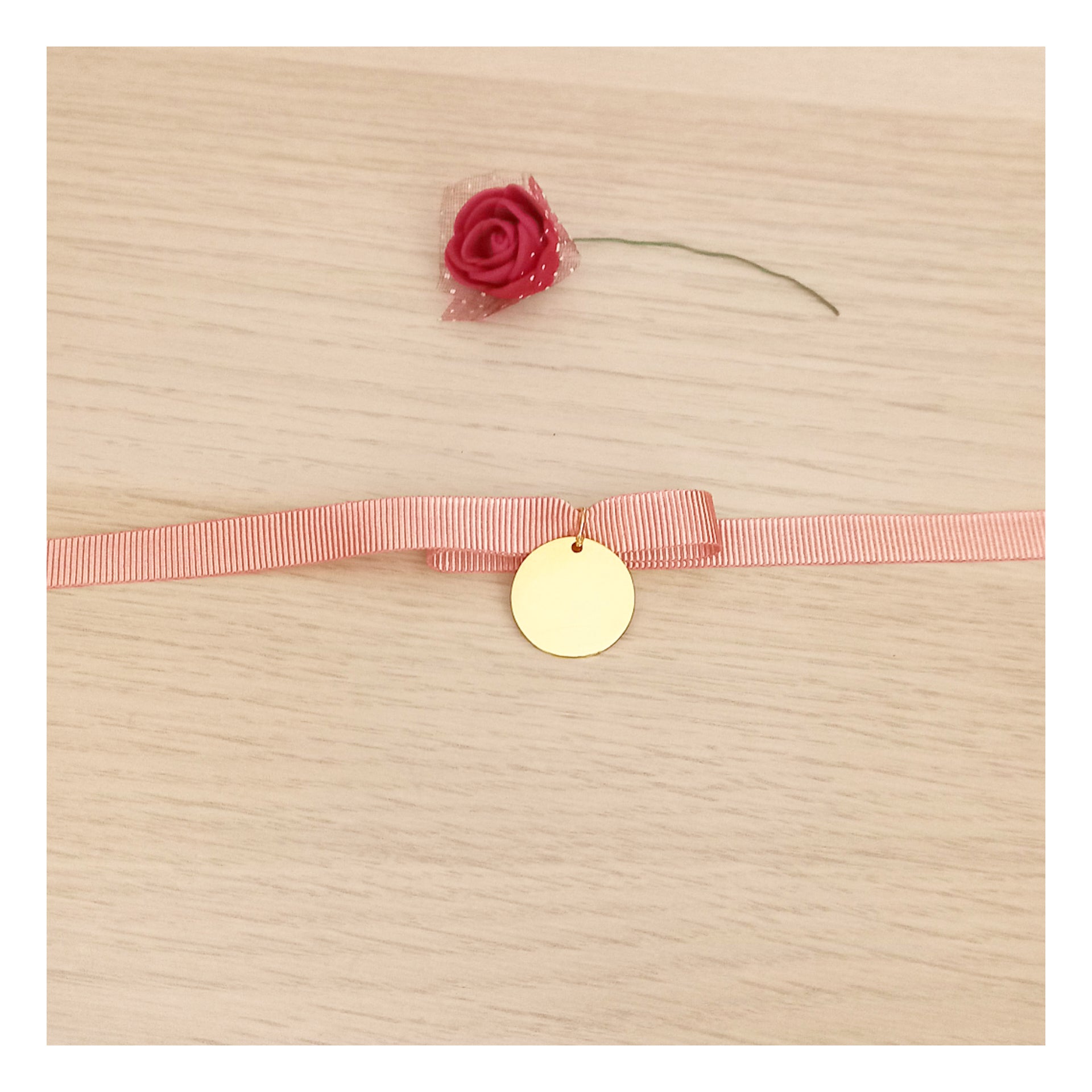 Un bonito detalle para tu ramo de novia. Un lazo de rayón con el color que prefieras y una plaquita redonda 19 mm de acero baño dorado para grabar la frase especial y recordarlo siempre.