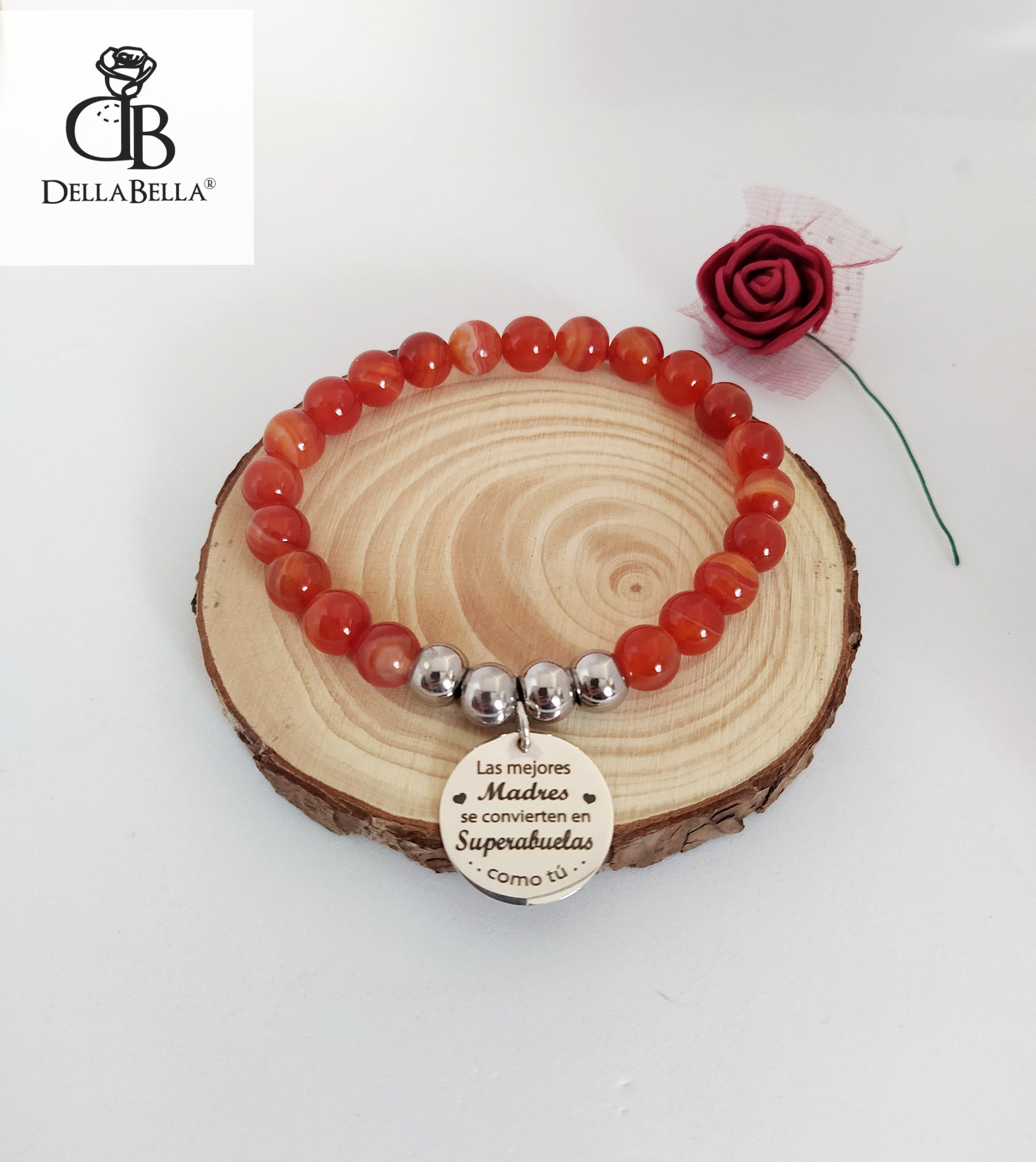 Pulsera elástica con piedras de ágata, bolitas y chapa de 18mm en plata de ley 925.