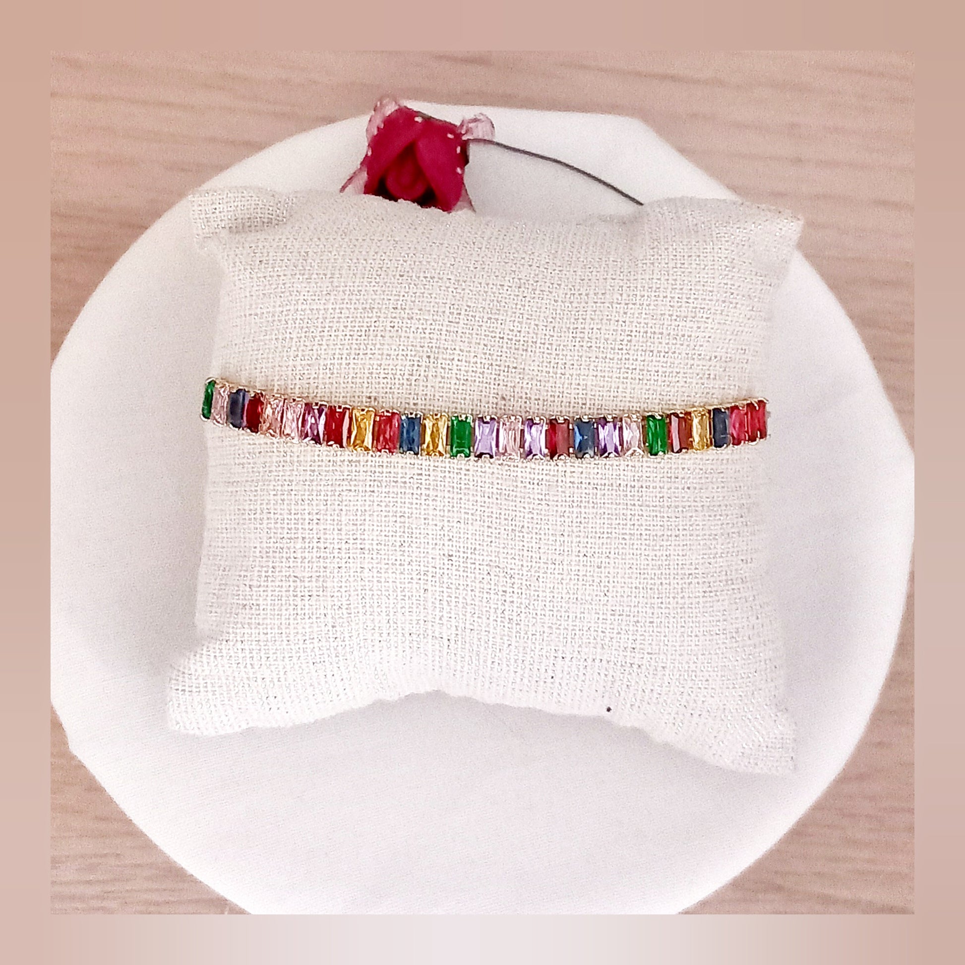 Una brillante y elegante pulsera de cristales de varios colores y cadena redonda ajustable con bolita de Golfi dorado para mujer.