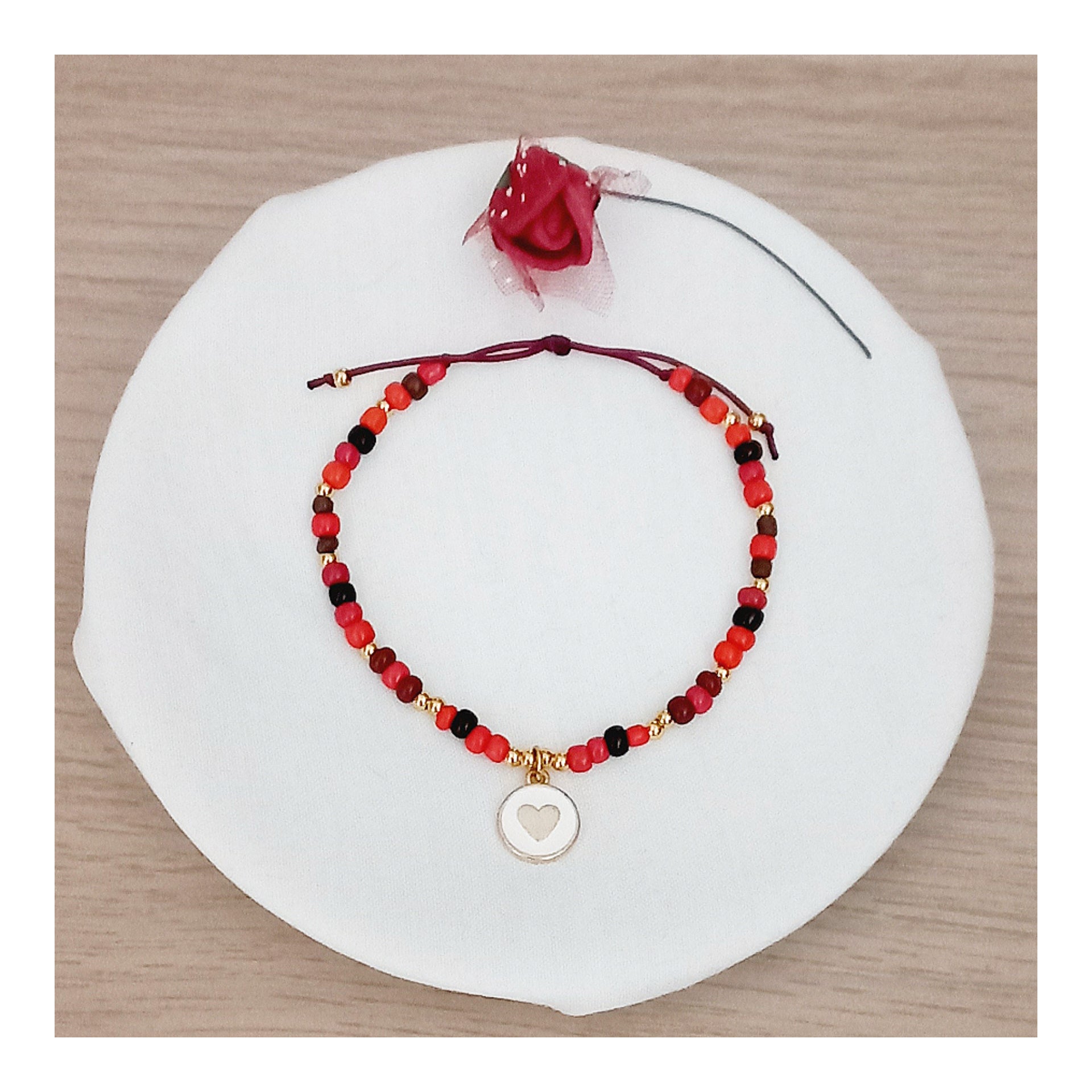 Una bonita pulsera de hilo con bolitas rojas, negras, de acero doradas y un colgante de corazón dorado en el centro.