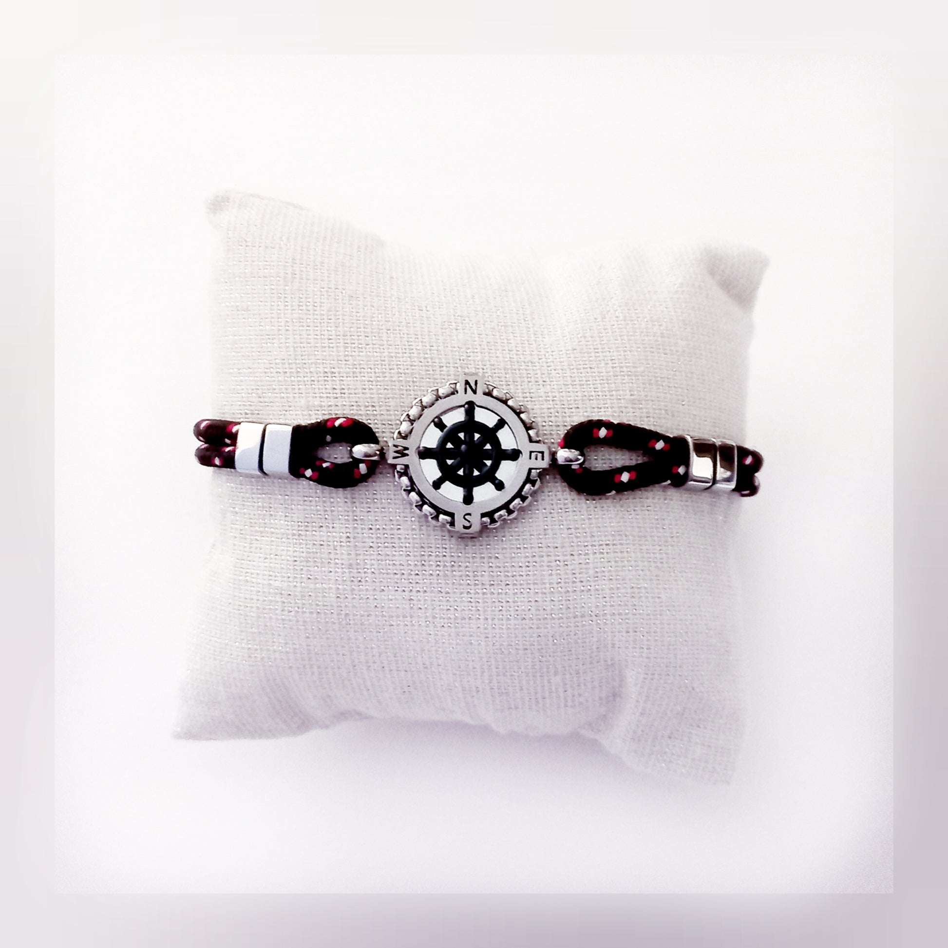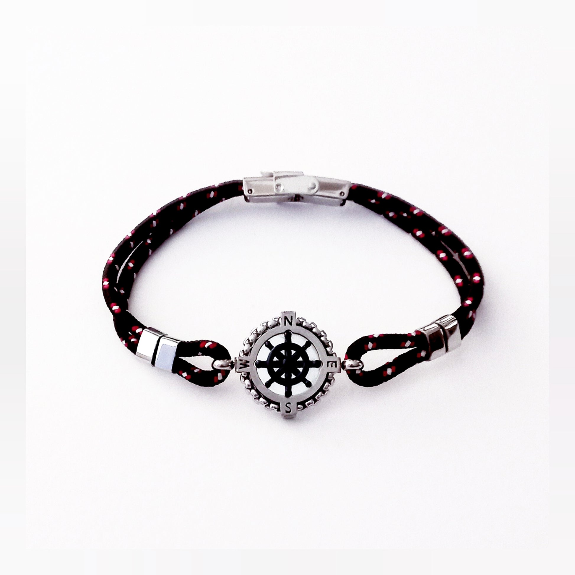 Pulsera de cuerda negra y roja con la forma de una brújula y en el centro un timón de barco, en acero inoxidable para hombre.
