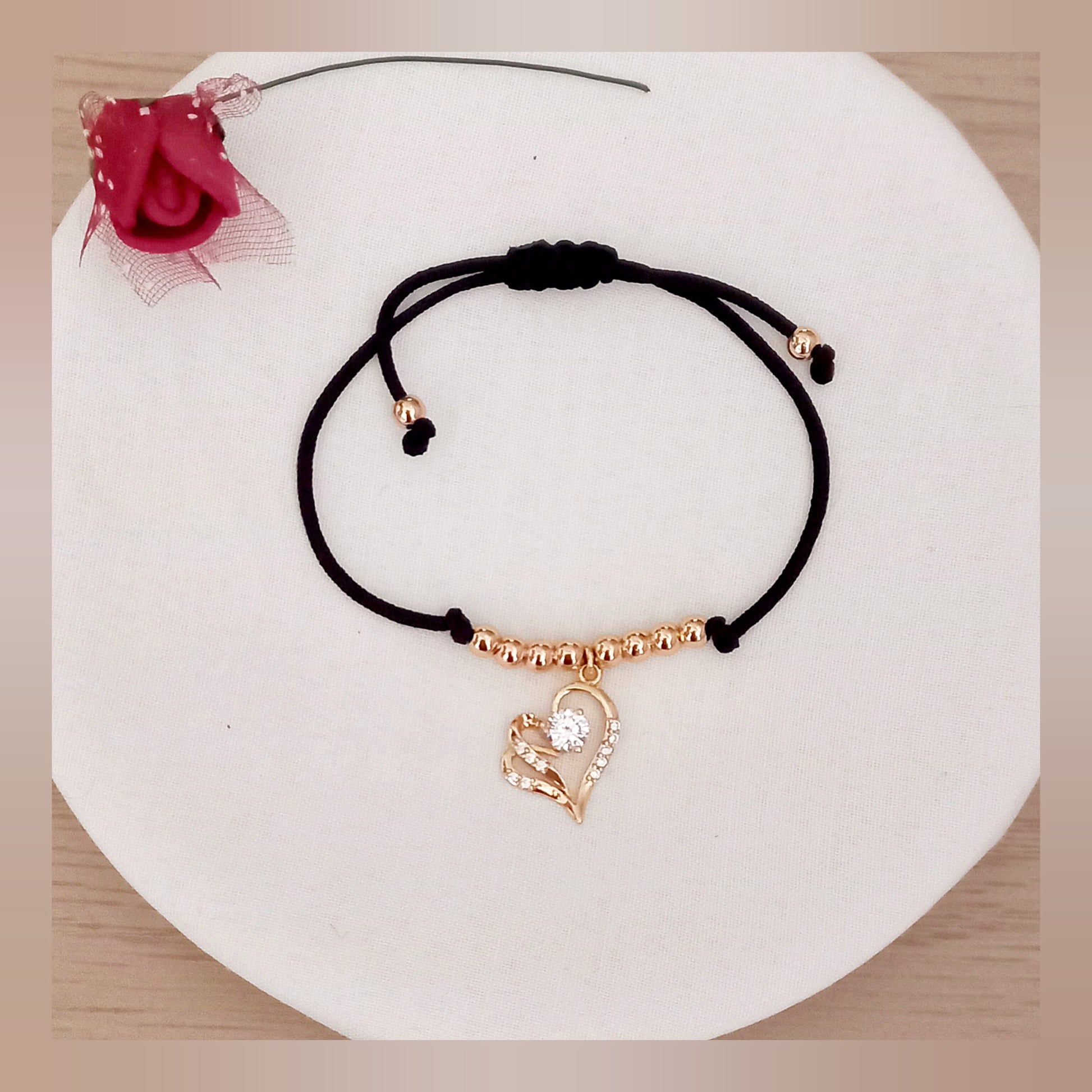Una bonita y brillante pulsera de cuerda negra ajustable con 8 bolitas y un colgante de corazón y circonitas para mujer.