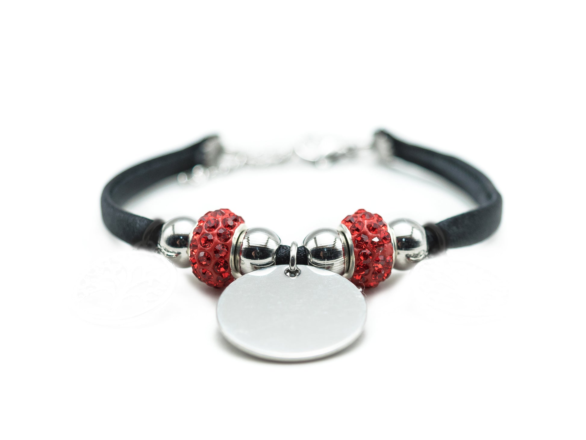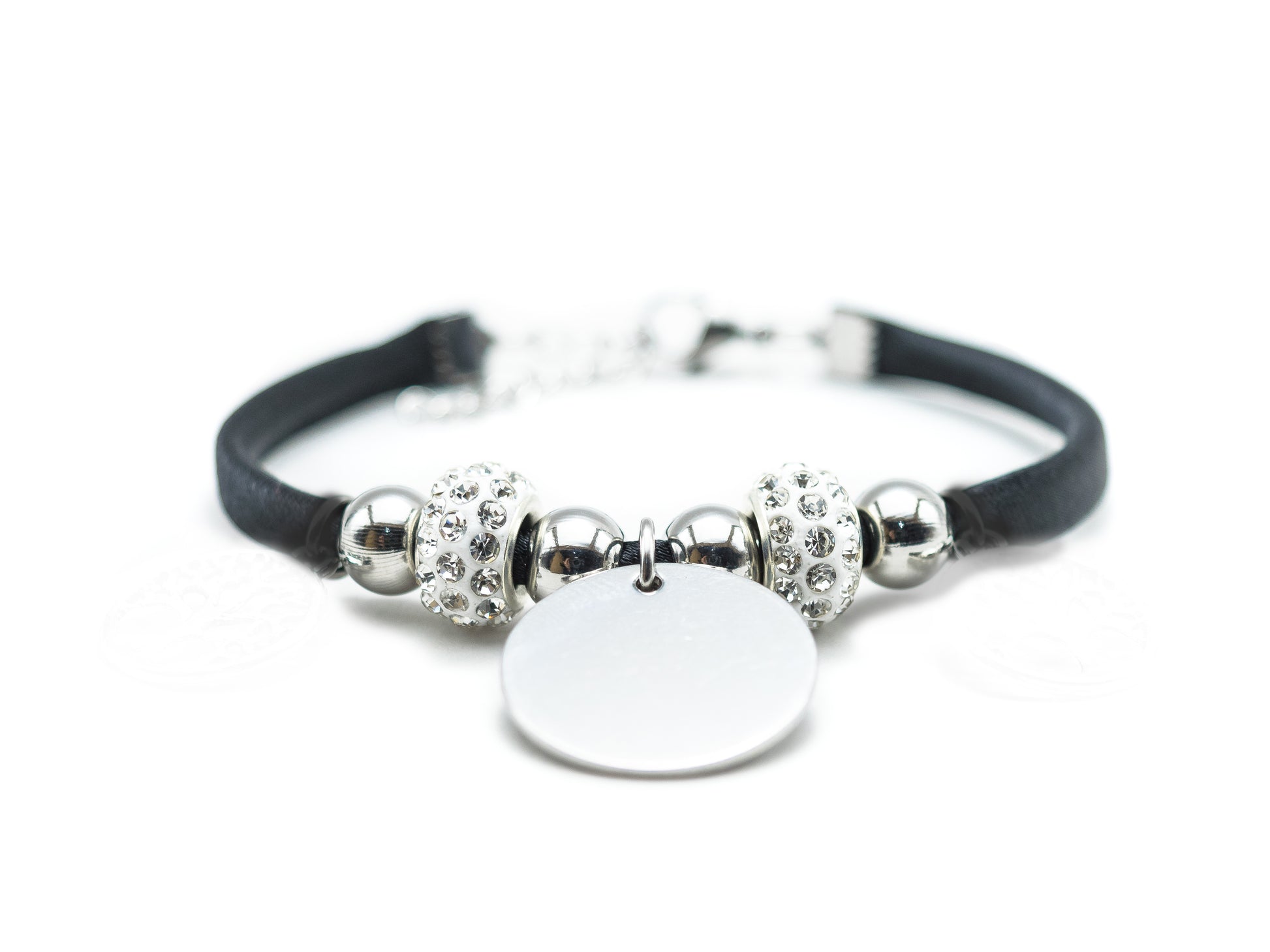 Pulsera personalizada de lazo de seda negro, bolitas, placa y cierre de acero inoxidable para personalizar.