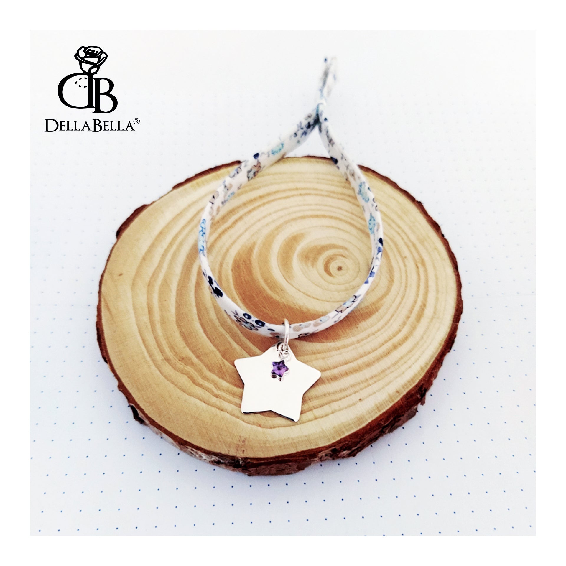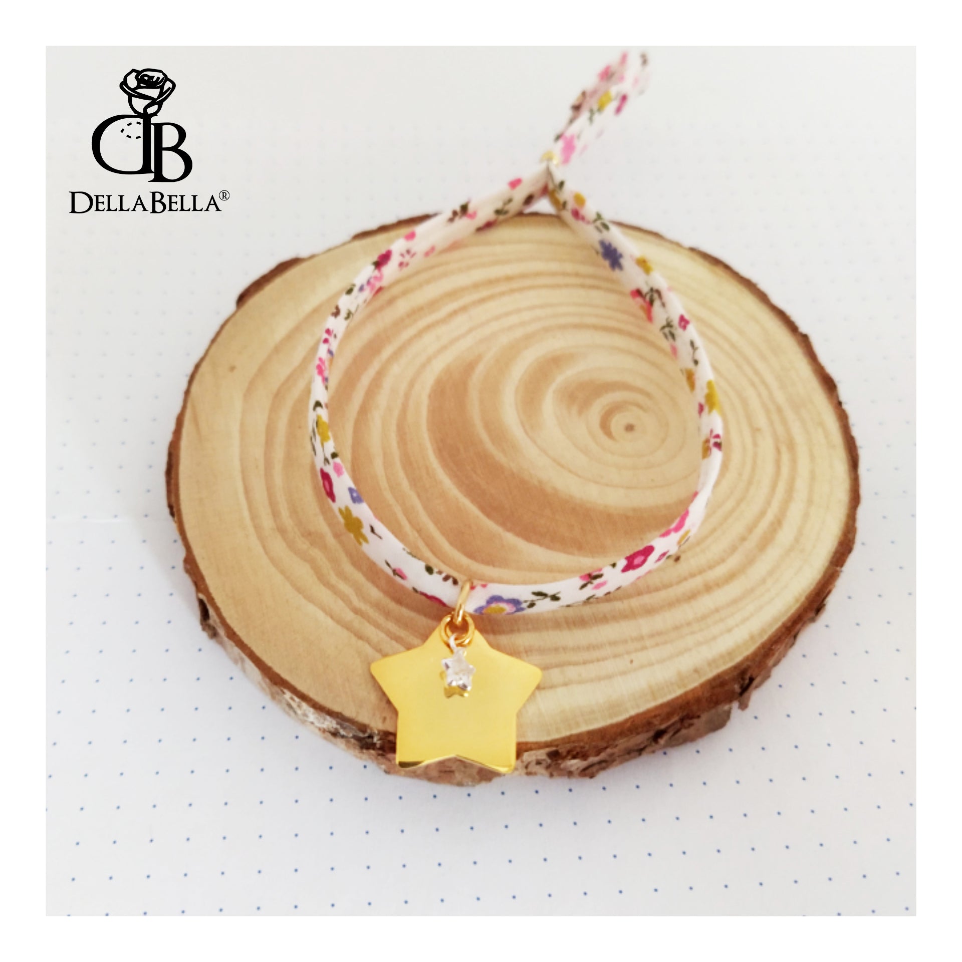 Pulsera para personalizar con colgante en forma de estrella y otro pequeñito de cristal, cordón de algodón con dibujos florales y anilla para ajustar a la muñeca.