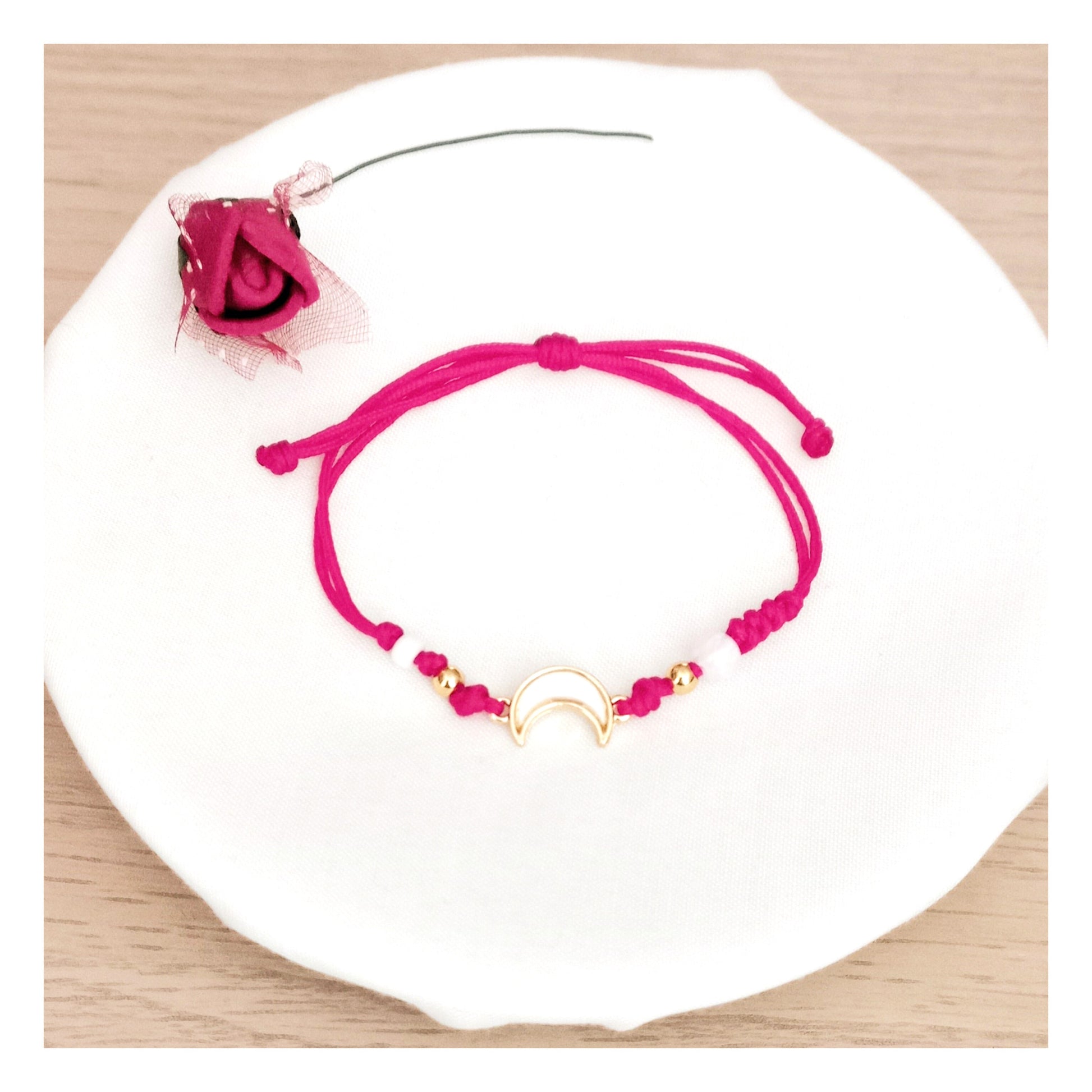 Una bonita pulsera de cuerda con una luna en nácar en el centro, 1 bolita de acero dorado en cada lado y bolitas blancas. Ajustable con nudo corredizo y talla única.