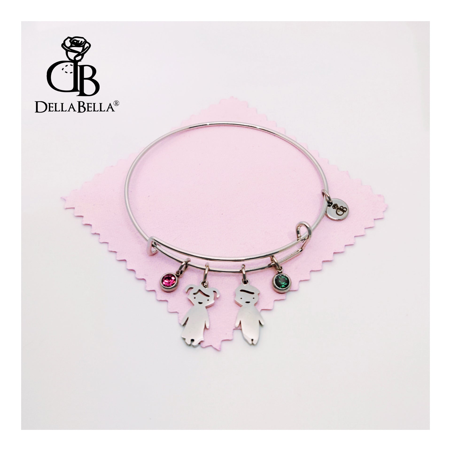 Preciosa pulsera rígida con colgantes de niños/as y cristales de colores en acero inoxidable.