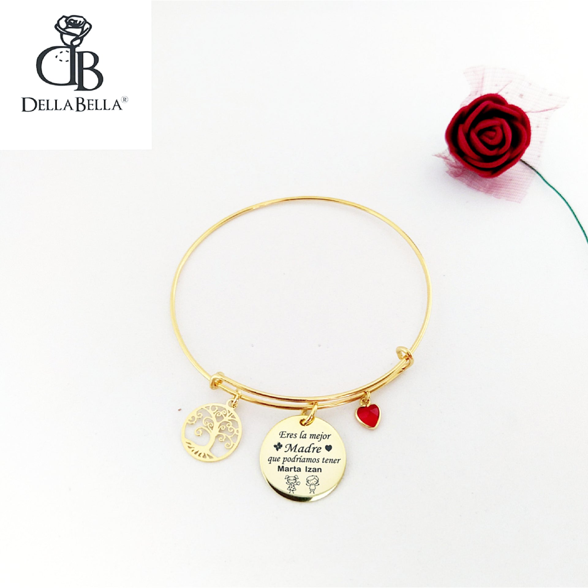 Pulsera rígida en plata de ley baño dorado, con colgante del árbol de la vida calado, colgante circonita en corazón y placa de 19 mm con grabado incluido.