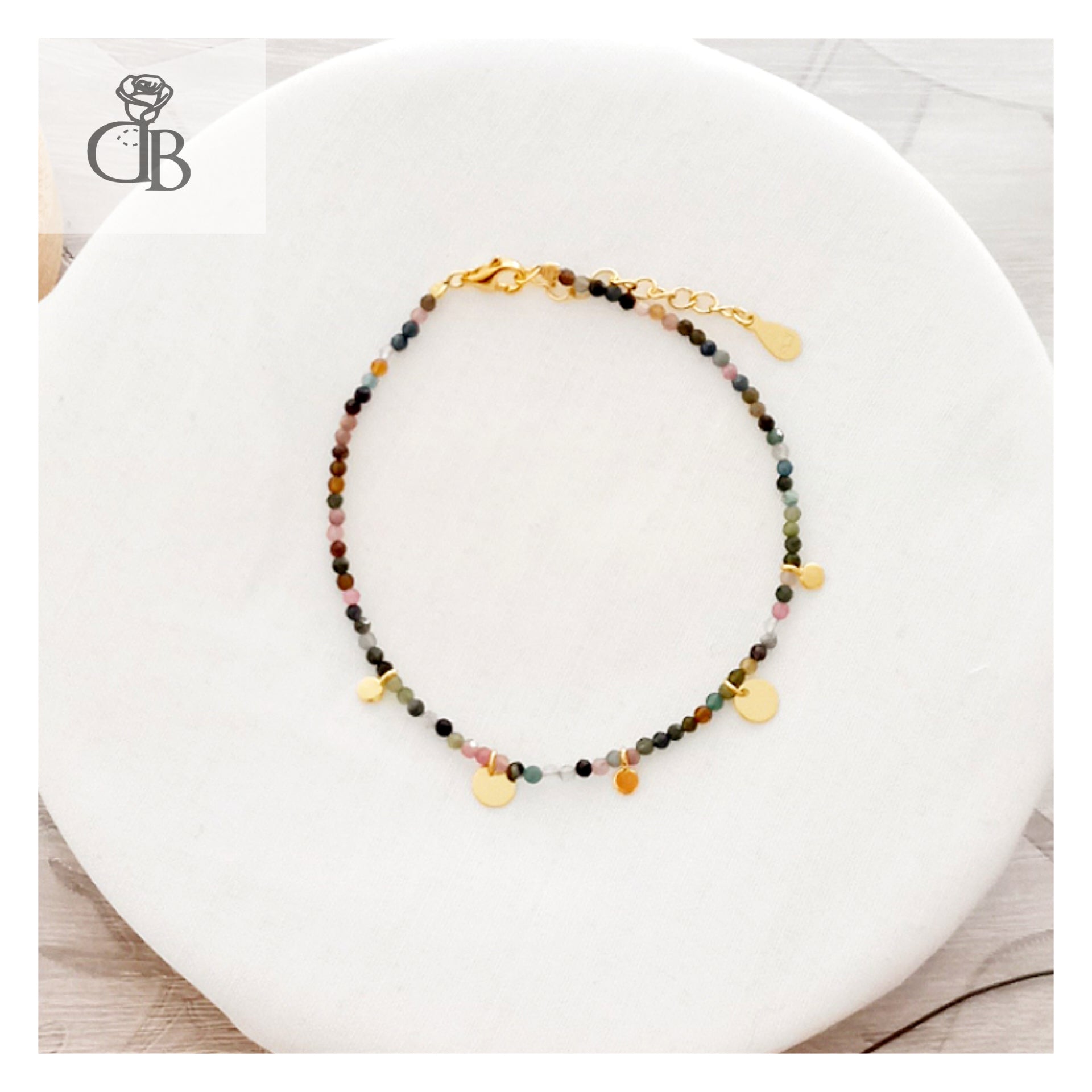 Bonita pulsera con bolitas de turmalina de varios colores, plaquitas redondas en varios tamaños y cadena extensible en plata de ley baño oro para mujer.