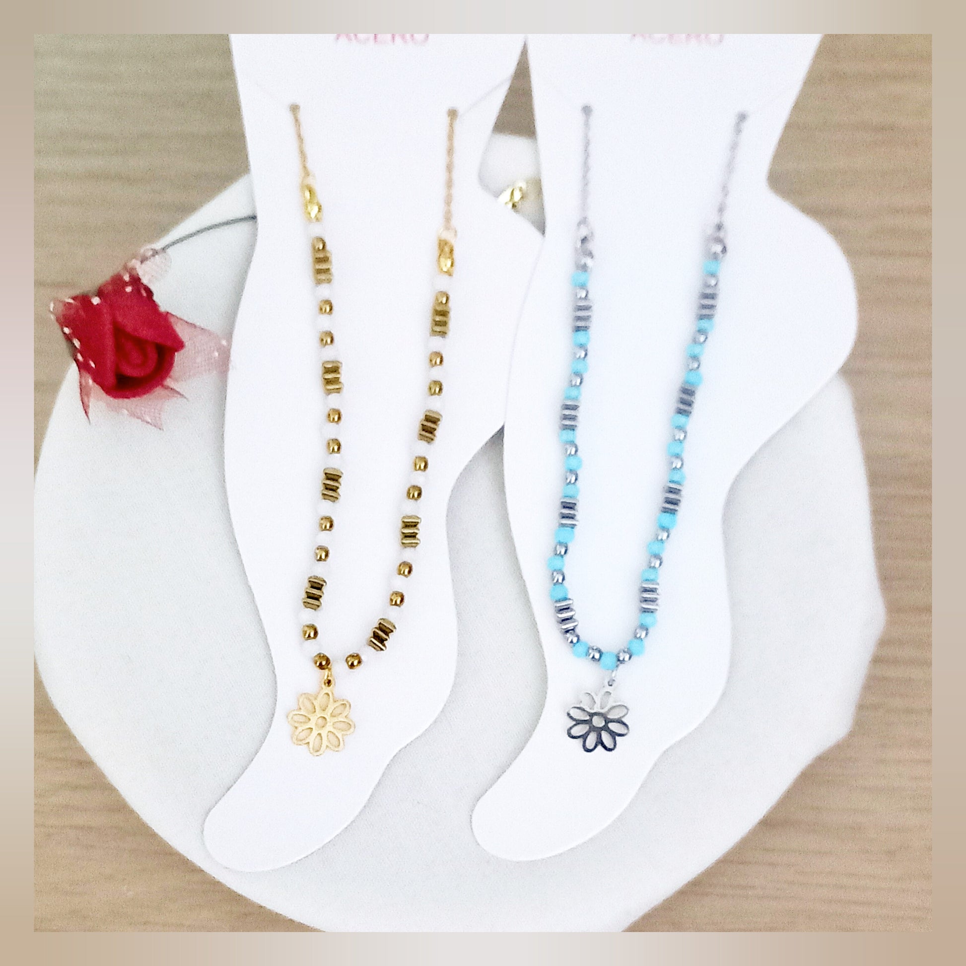 Tobillera bolitas y flor acero